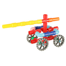 Komplektā ir iekļauti riteņi, kas dod iespēju būvēt transportlīdzekļus.