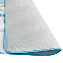 Zem paklājiņa ir siltumizolējošas folijas slānis, tāpēc to var ņemt līdzi uz dārzu vai pludmali.