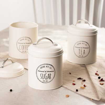 RIO containers with metal lids IRON CANISTER DIA: 11*H12-HH16CM, MATERIAL: POWDER COATED+SILK PRINTING WITH S/S HANDLE ON THE TOP COLOR: 11-0604 TPG, BEIGE WITH HOMLA LOGO ON THE BOTTOM
