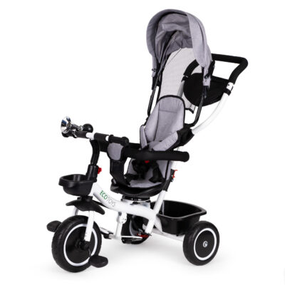 ECOTOYS TRICYCLE For children over 6 months old Safe, durable steel frame Rotating 360° seat Removable canopy, safety bars, and push handle 5-point safety harness Safety bars Steering handle for parent control Foldable footrests Collapsible canopy Basket and pouch for small items Product by ECOTOYS COMFORT & PROTECTION The ECOTOYS tricycle combines many practical features…