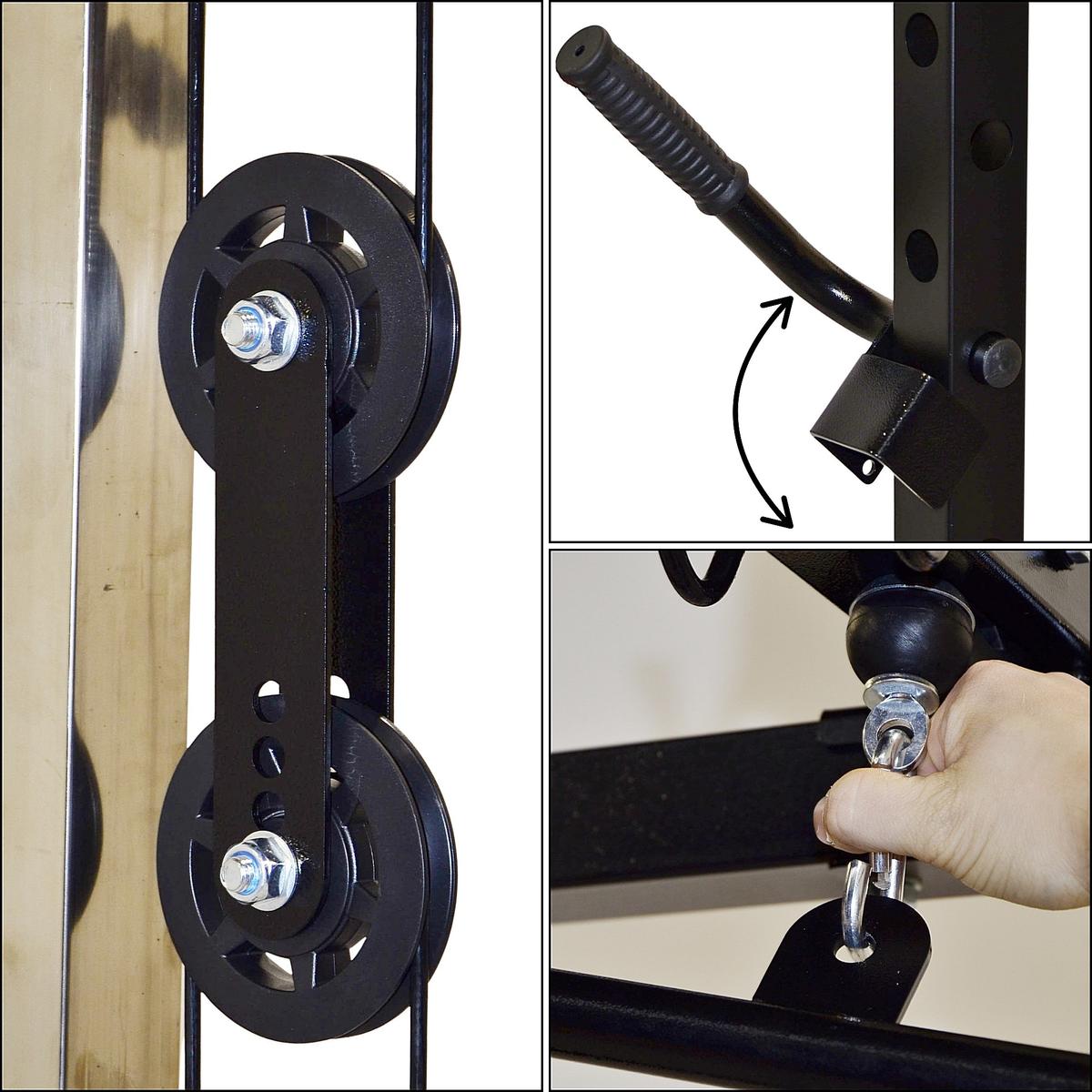 The dimensions of 215 × 145 × 111 cm allow the gate to fit into most workout rooms. The design does not take up a large area, despite the extensive functions. It is an ideal choice for garages, basements and dedicated training rooms.