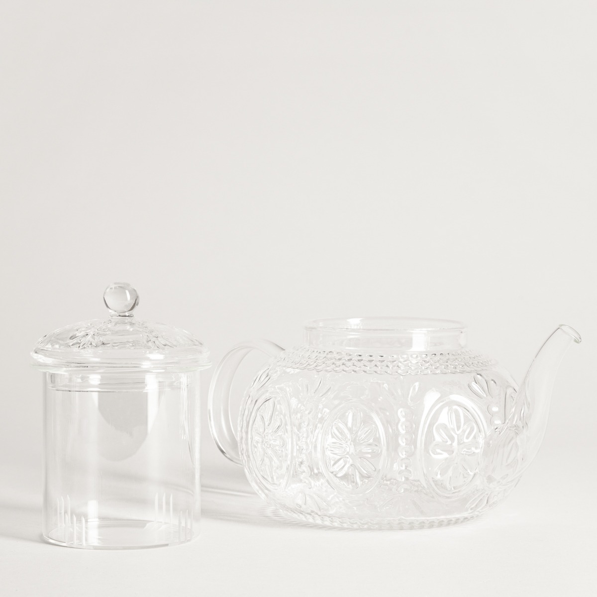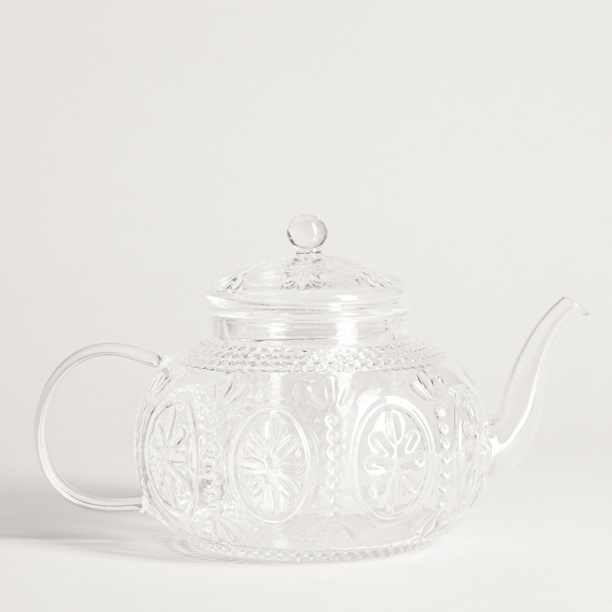 - Made of clear glass with decorative embossing