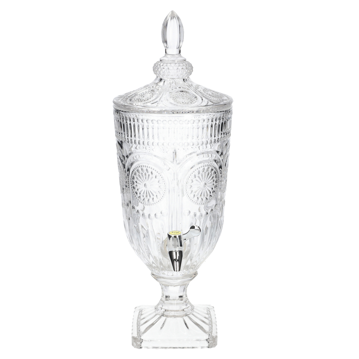 With a capacity of 2.8 liters, the BARREL jar is perfect as an accessory for all kinds of events. Due to the use of transparent glass, you can control the level of the contents in real time, as well as conveniently dispense the beverages you are pouring with the leak-proof faucet. The jar has a rounded shape, rests on a solid and stable leg, and the lid has a convenient knob that serves as a handle. The walls are decorated with a structured, openwork pattern reminiscent of arabesques. The width of the jar is 17 cm.