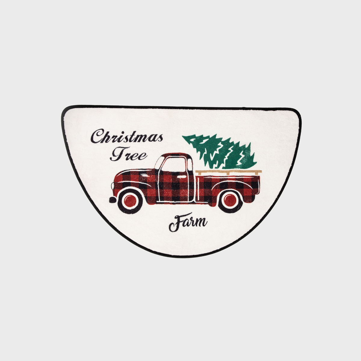 A colorful bathroom rug with a Christmas theme will bring a cheerful atmosphere to your interior. A retro red car, decorated with a black and red grill, stands out against the bright background and carries a Christmas tree on its roof. The inscription ‘Christmas Tree Farm’ sets a warm, festive mood, reminiscent of the family trips to the farm to pick out a Christmas tree known from the movies.