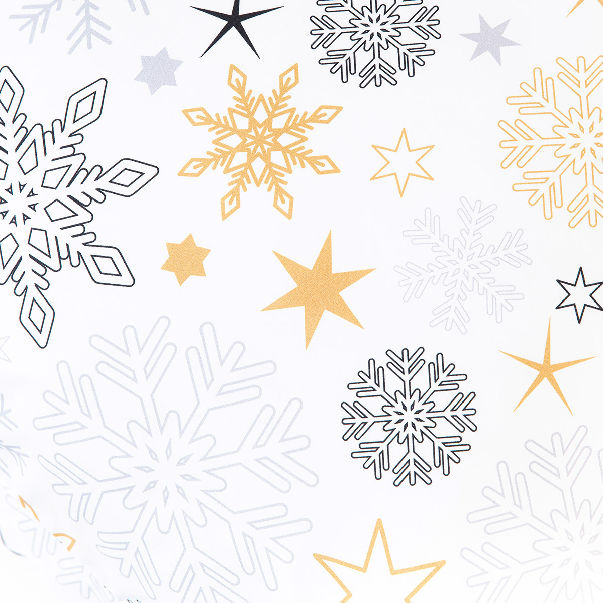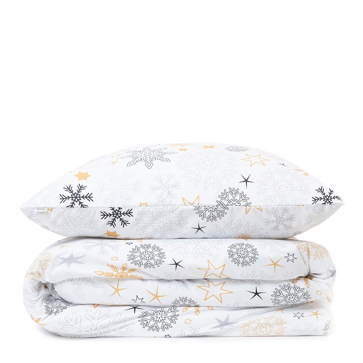 The FLOCO bedding set consists of a 160 x 200 cm pillowcase and two 70 x 80 cm pillowcases. Snowflakes of different colors and patterns have been placed on the white fabric. The snowflakes are dominated by shades of yellow, black and grey.