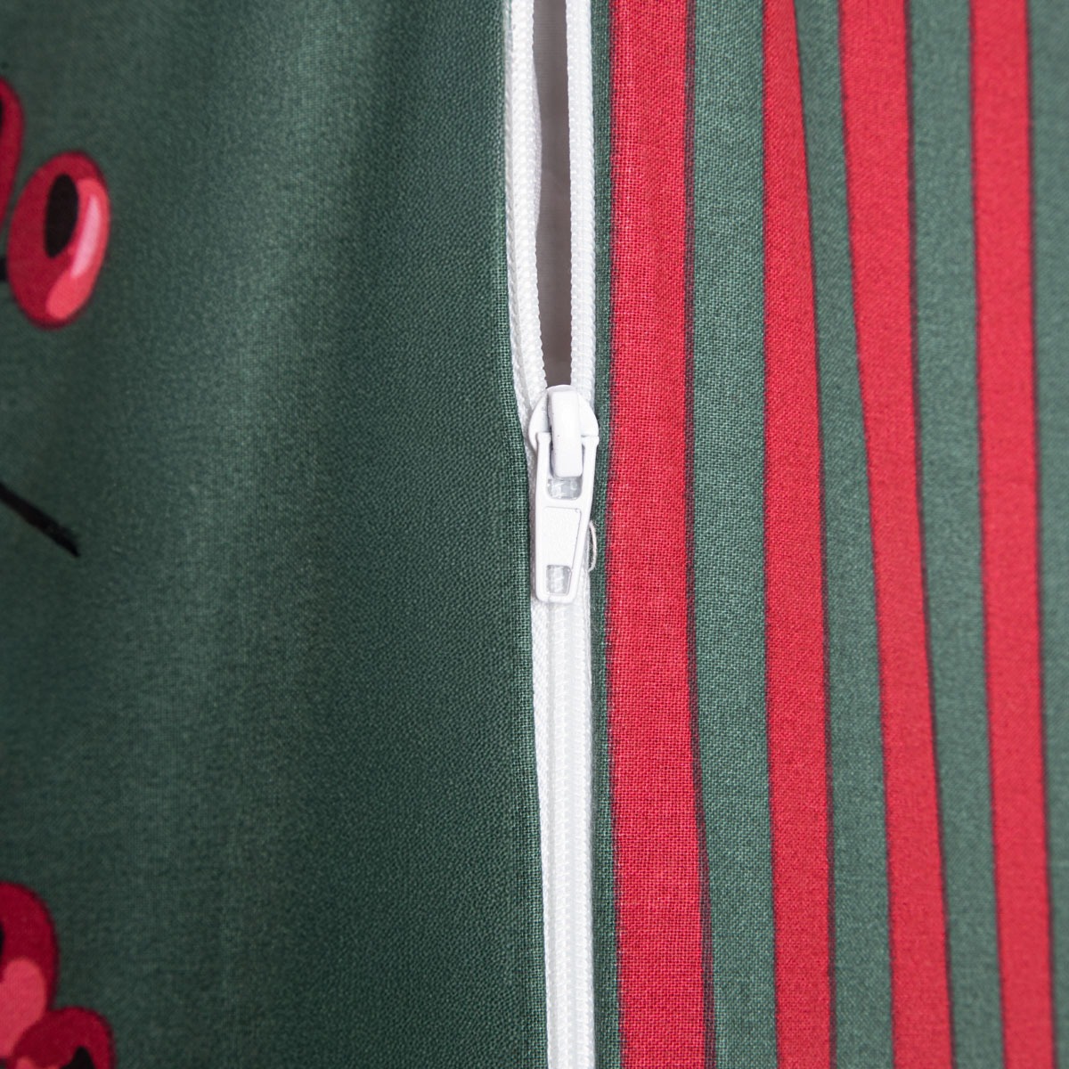 The double-sided bedding has a colorful, festive design – a pattern with sprigs of holly on a green background on one side and green and red stripes on the other. Red and green are timeless festive colors that will blend perfectly into any seasonal setting. Cotton bedding with a festive pattern is a beautiful decoration for your bedroom.