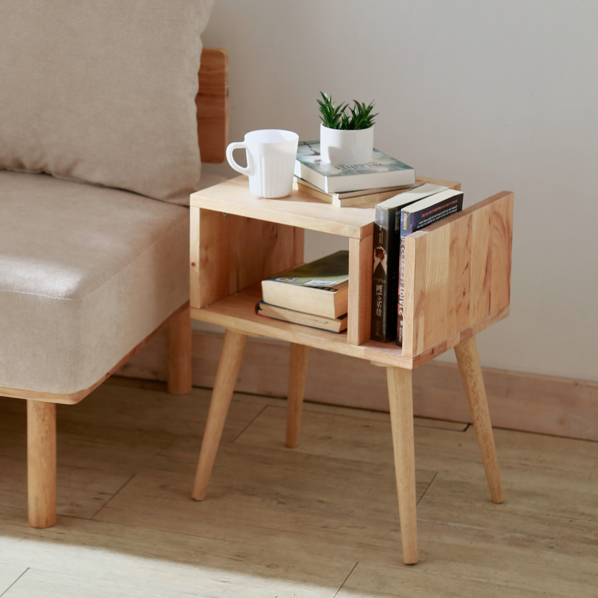 The HOMLA SINAR wooden nightstand will be the perfect complement to your bedroom decor. It is distinguished by an interesting, modern design with 2 shelves – a standard shelf under the top and a narrow, high shelf for books. The natural design makes the cupboard fit perfectly into most bedroom arrangements. This makes it not only a practical piece of furniture, but also a stylish addition.