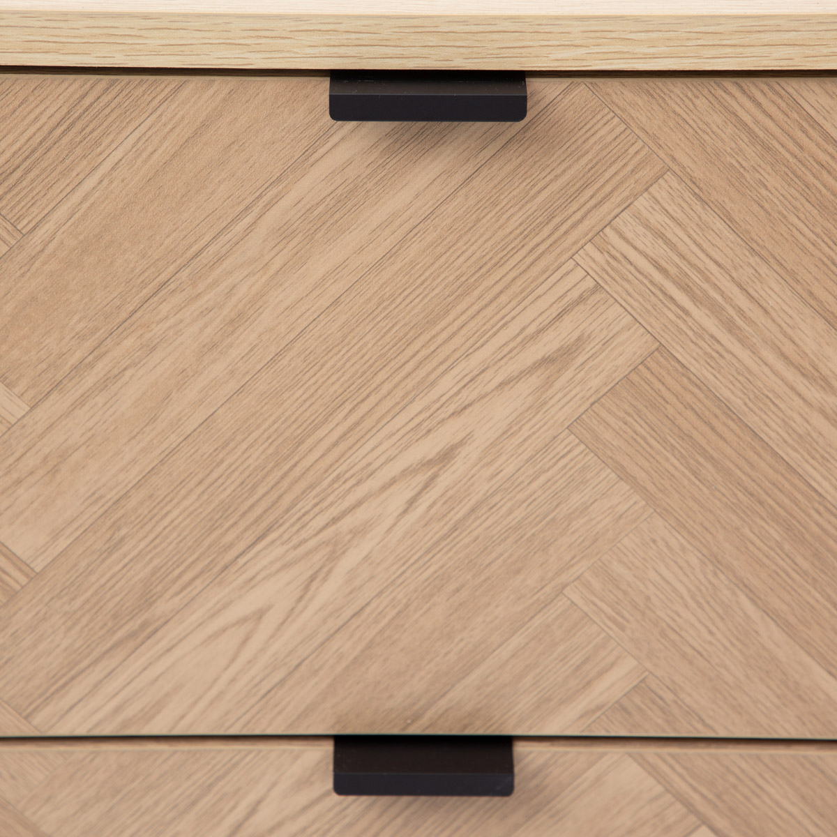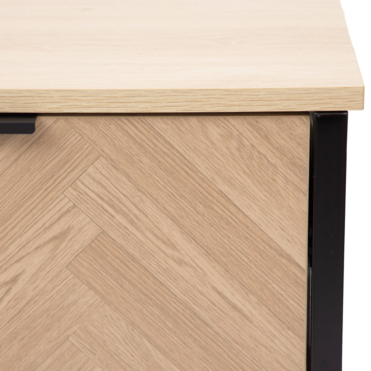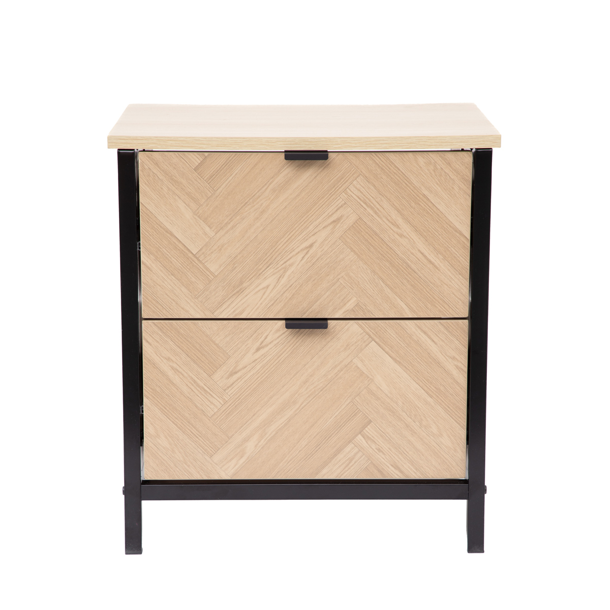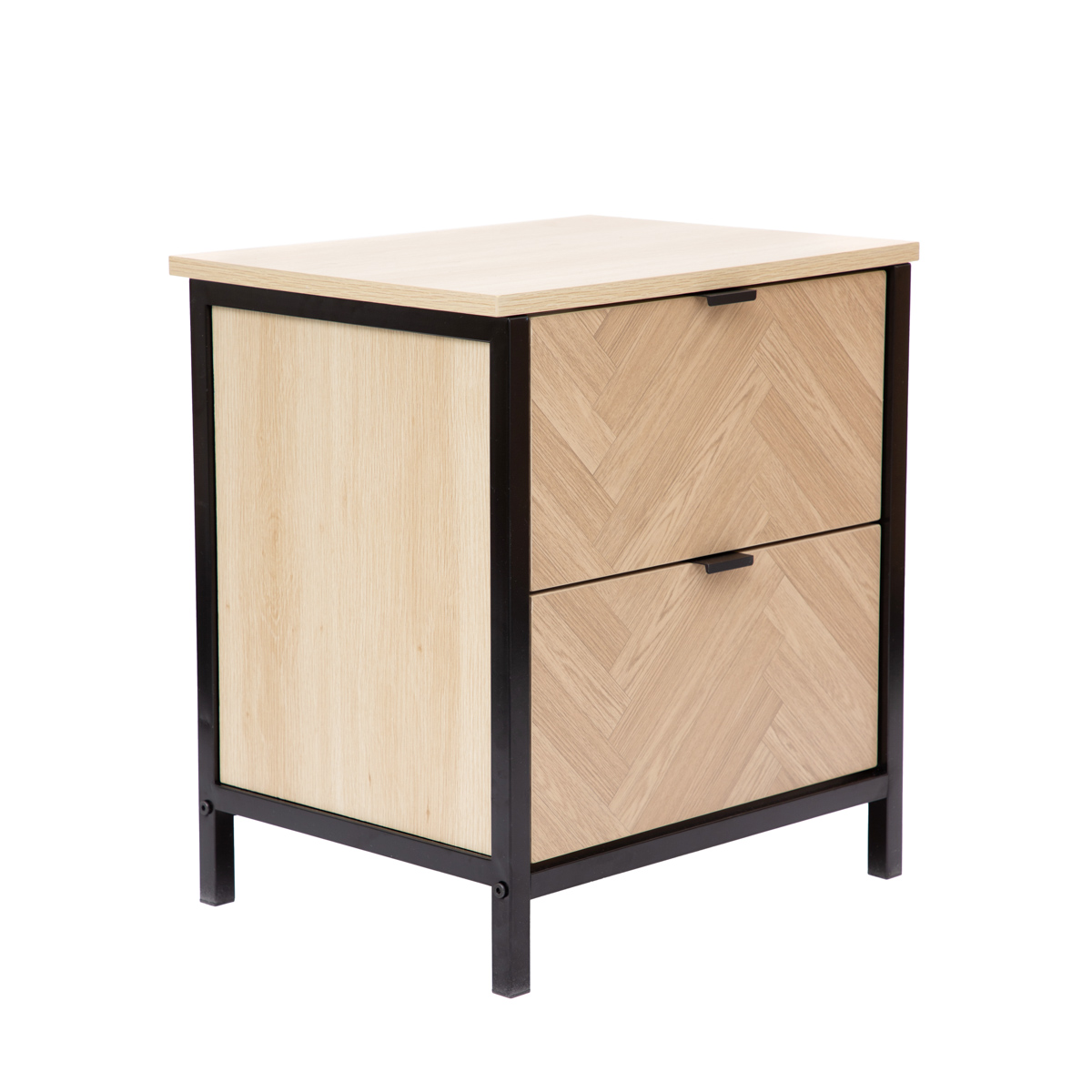 The stylish HOMLA SWEN bedside cabinet will perfectly complement the design of a modern bedroom. Its front is decorated with a herringbone pattern, which is an effective eye-catcher and adds a unique character to the furniture. The natural design is complemented by a black metal frame, which introduces a distinctive loft accent. The cabinet fulfills not only design, but also functionality. Two capacious drawers will accommodate small items that are good to have at hand, in the evenings and in the mornings. This will make it much easier to keep things tidy next to the bed.