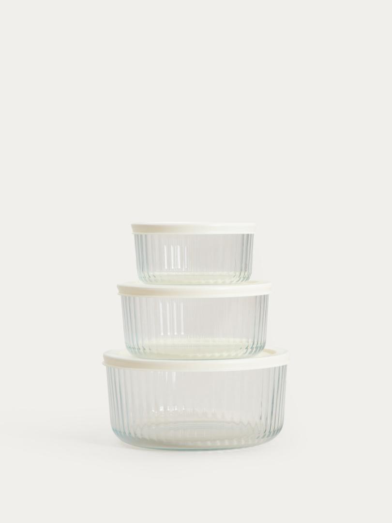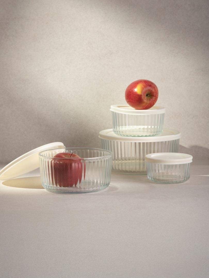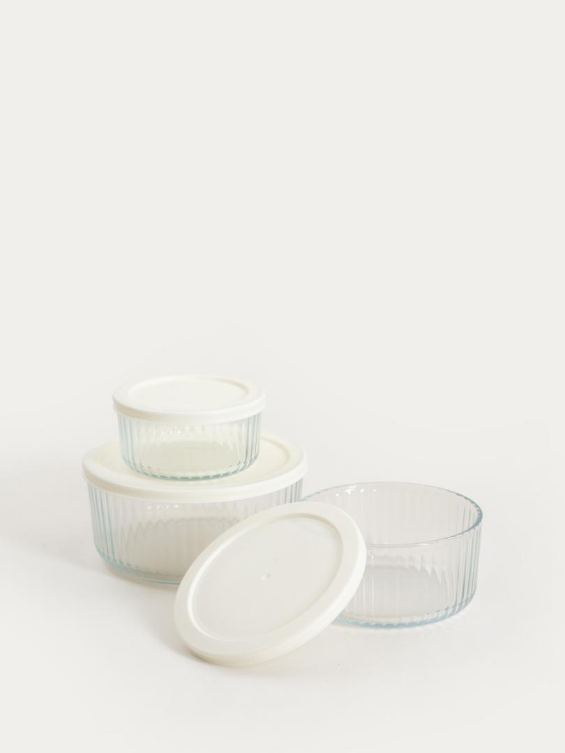 Set of SCATOLA boxes with cream lids 4 pcs Food contact product. Dishwasher: YES, Microwave: NO. Maximum temp: 60. set consists of four dishes with capacity: 1.4 l, 0.8 l, 0.4 l, 0.17 l Dimensions of the containers – 9×18.7 (HxW), 7.5×15, 6.3×12.5, 5.5×10