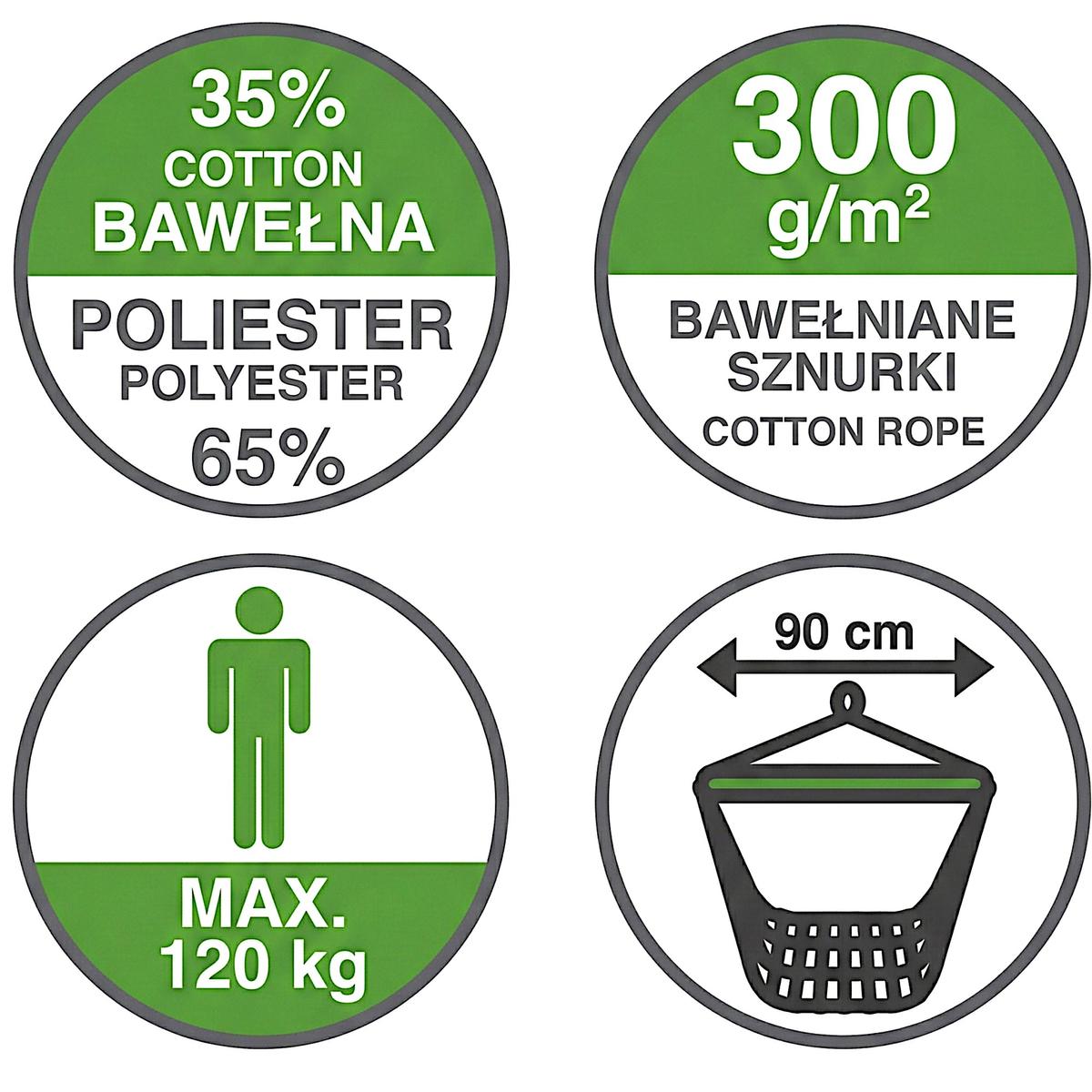 The armchair is made of durable cotton with a touch of polyester, which ensures adequate air circulation and high resistance to stress. Thanks to the sturdy wooden rod, the armchair is safe and well-balanced, allowing it to be easily hung at home, on the balcony or in the gazebo.