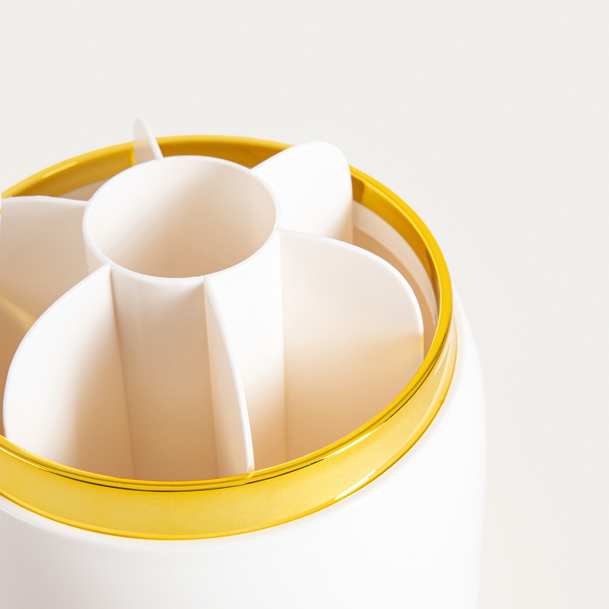 The ELENI organiser is an elegant and convenient solution for storing make-up brushes and other cosmetic accessories. Thanks to its swivel base, it provides quick and convenient access to all products, while the lockable lid protects them from dust and dirt. The stylish white finish combined with gold detailing gives it a luxurious feel that blends perfectly with modern settings.