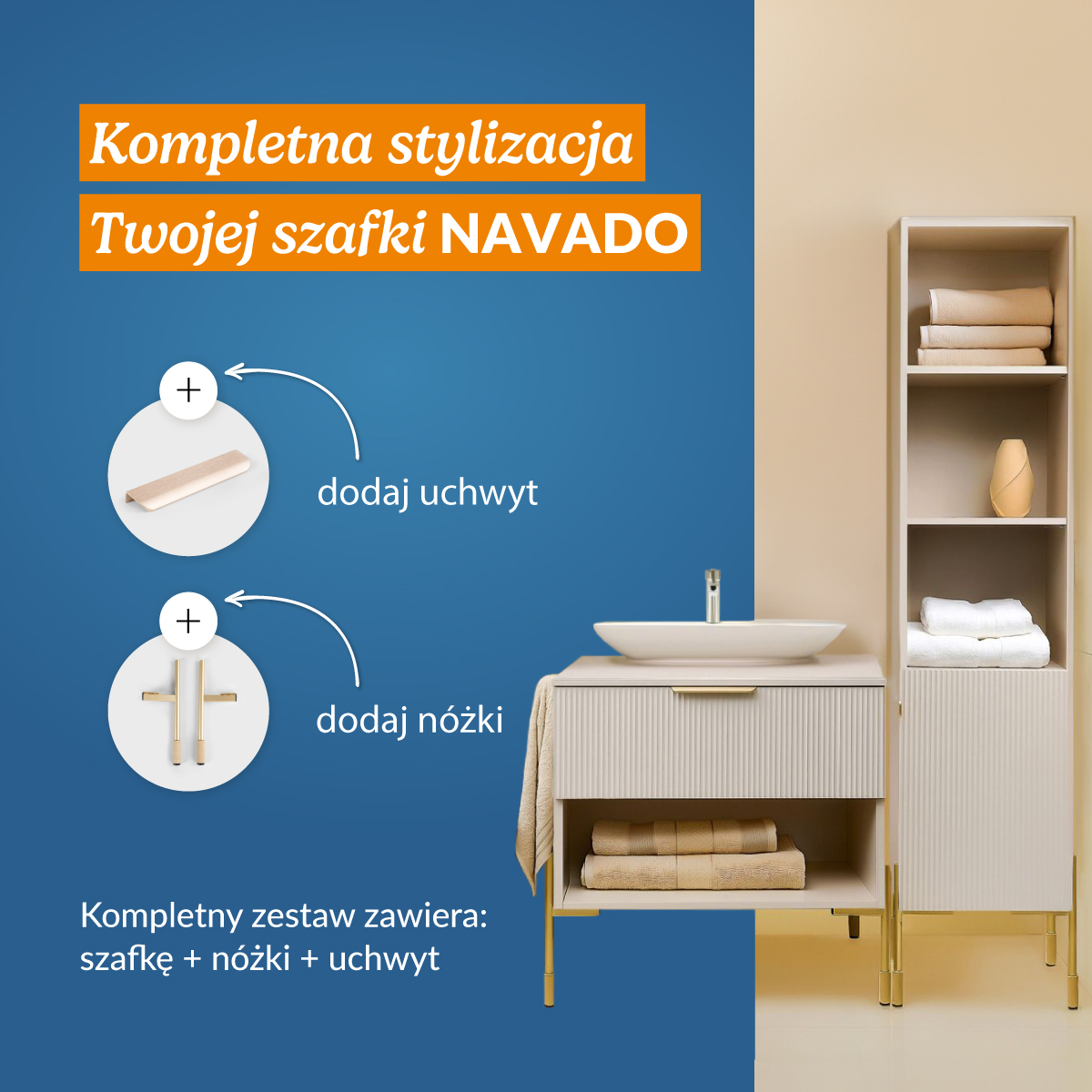 NAVADO can be free-standing (you need 2 sets of legs for it), however, we recommend mounting the cabinet to the wall and using a set of legs (a set consists of 2 pieces), which attached to the front of the furniture will have a double function – decorative and additional support for the cabinet.