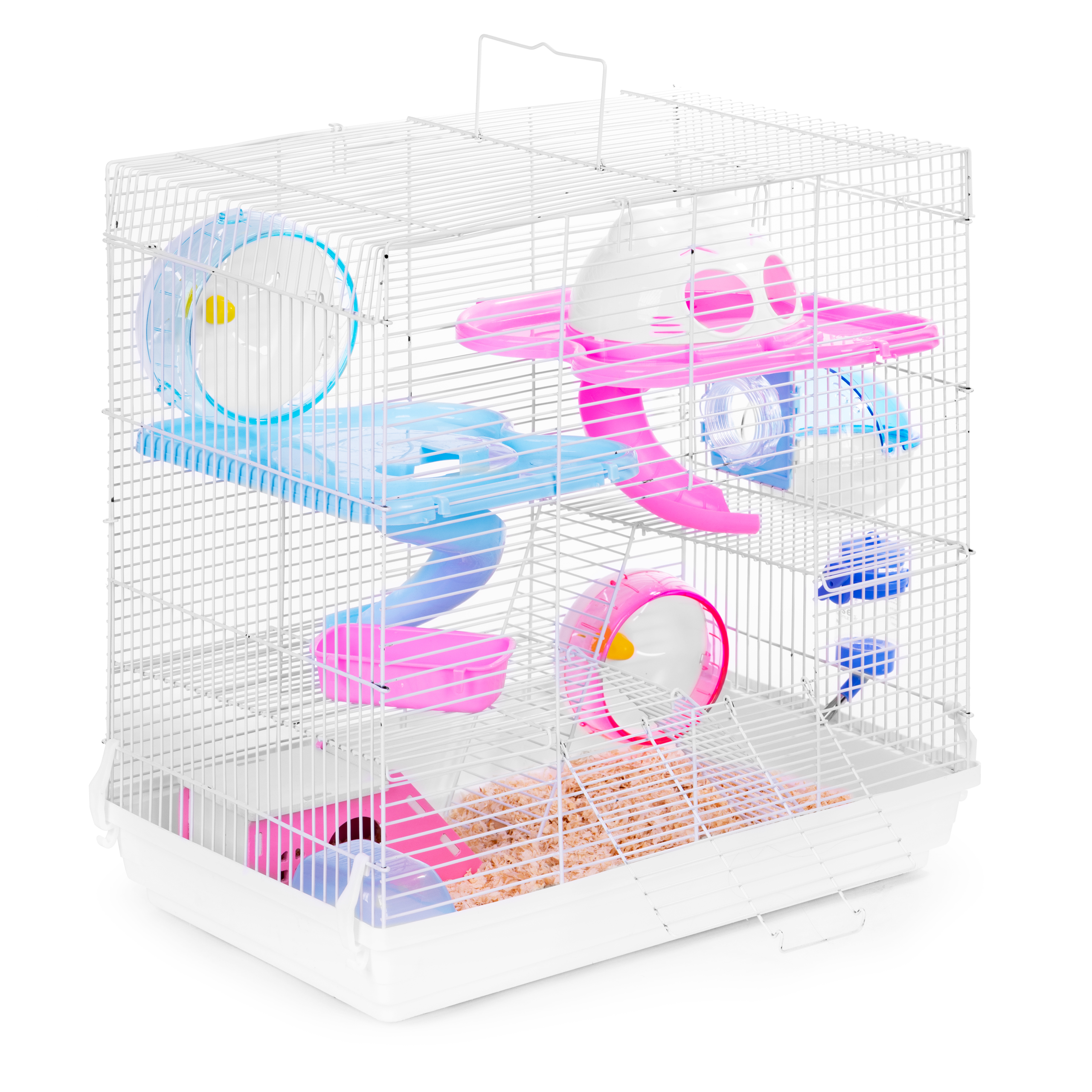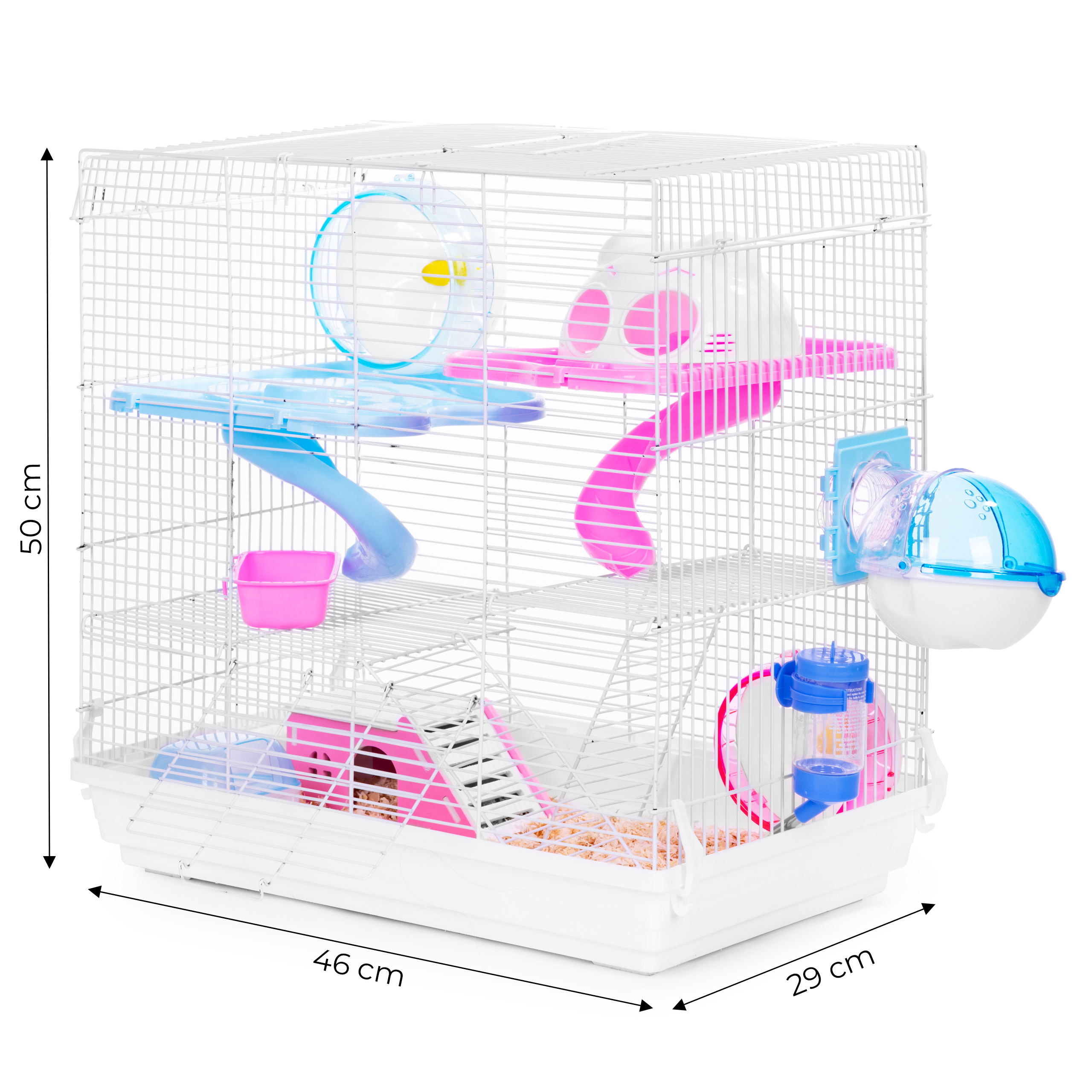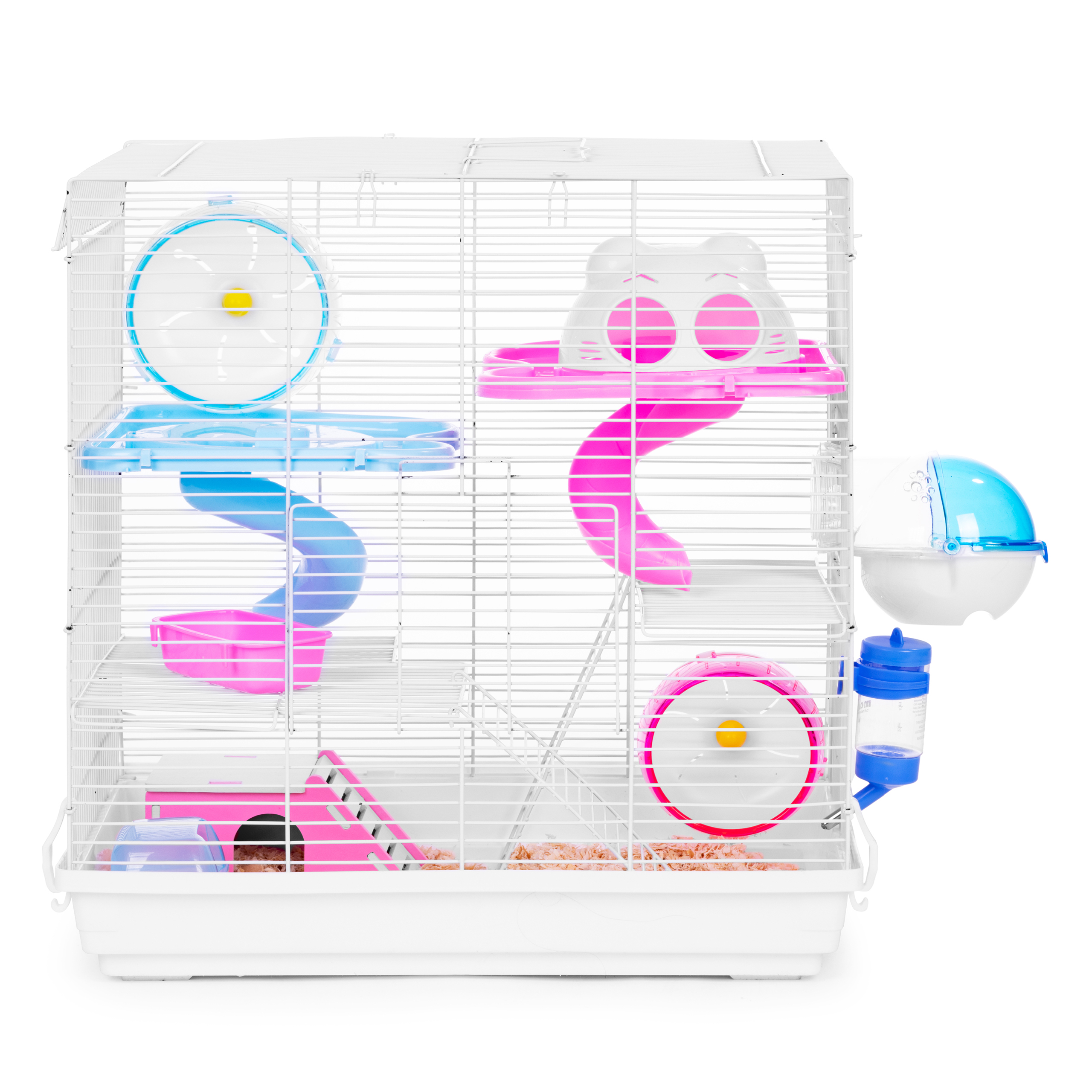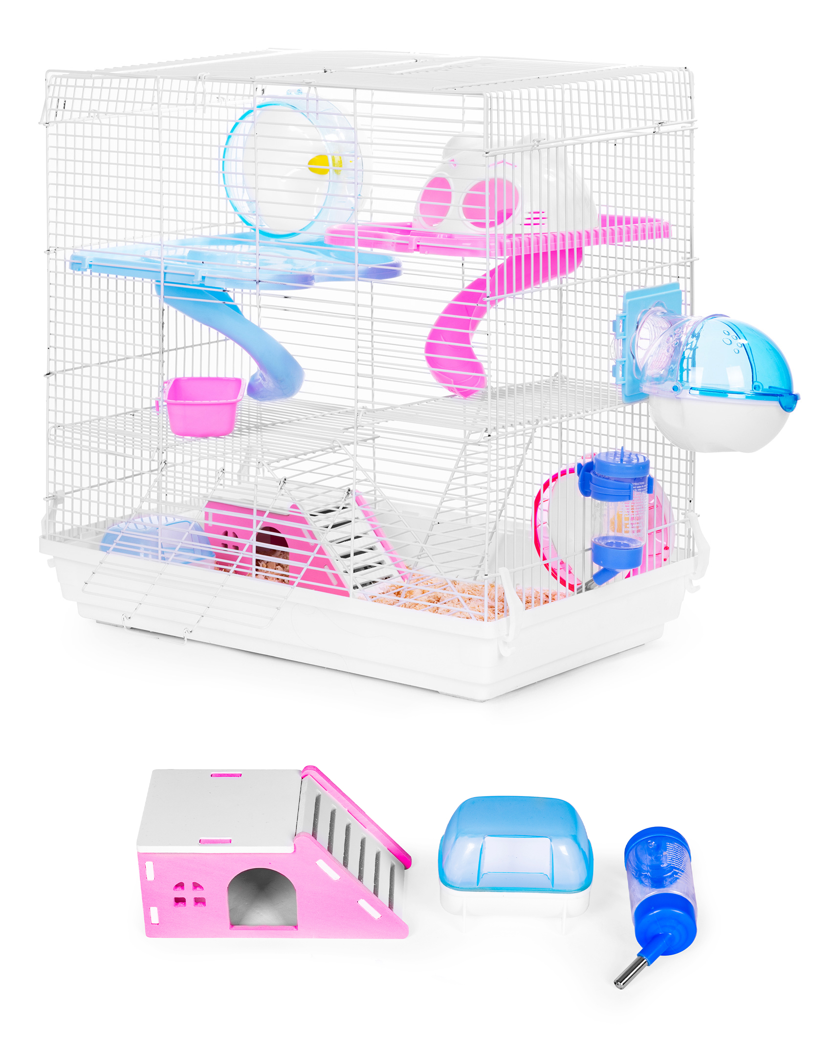 - Includes: two slides, house, exercise wheel, four levels, food bowl, water bottle