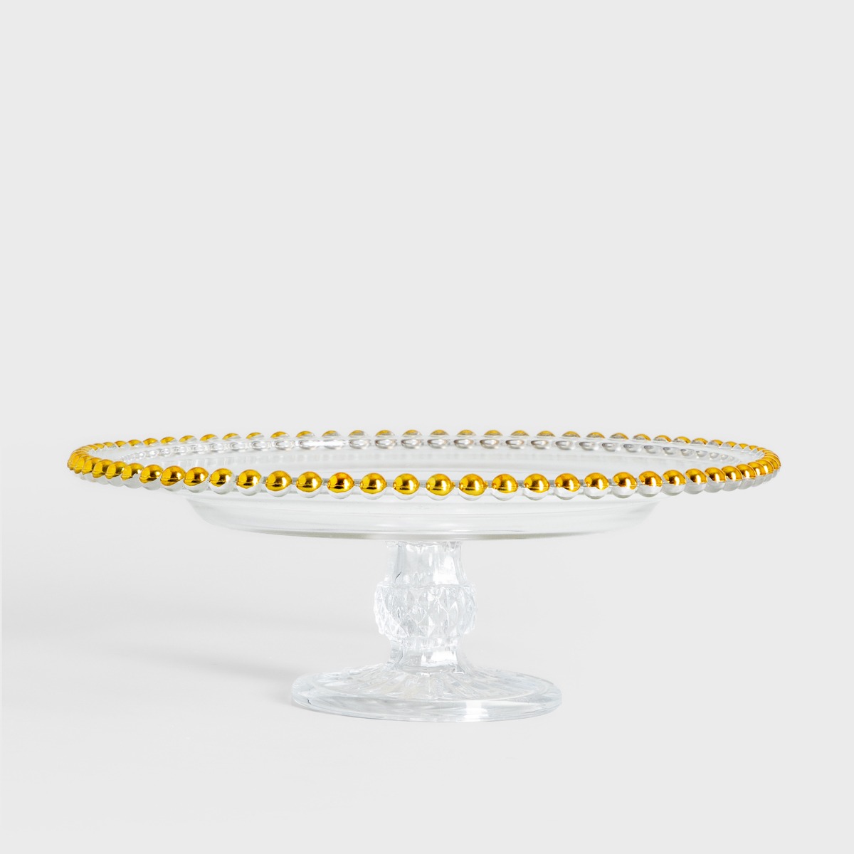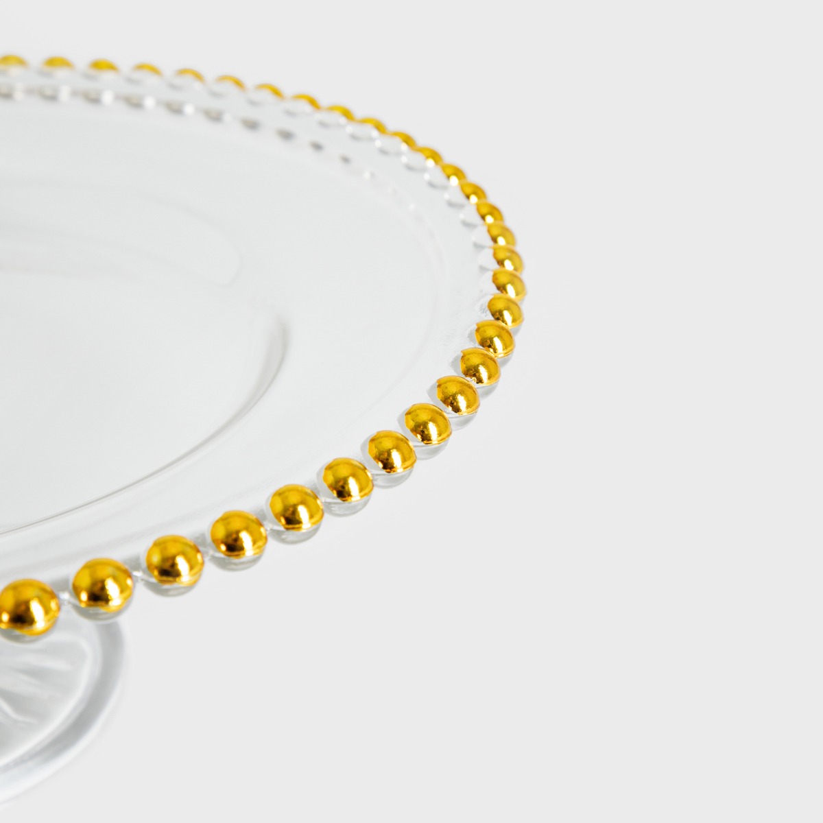 Do you want to present your baked goods and fruits in an impressive way? GOLDEN BALLS platter on an elegant leg is an ideal solution. Its transparent glass beautifully exposes the contents, and the decorative rim of gold balls adds to its chic and elegance.