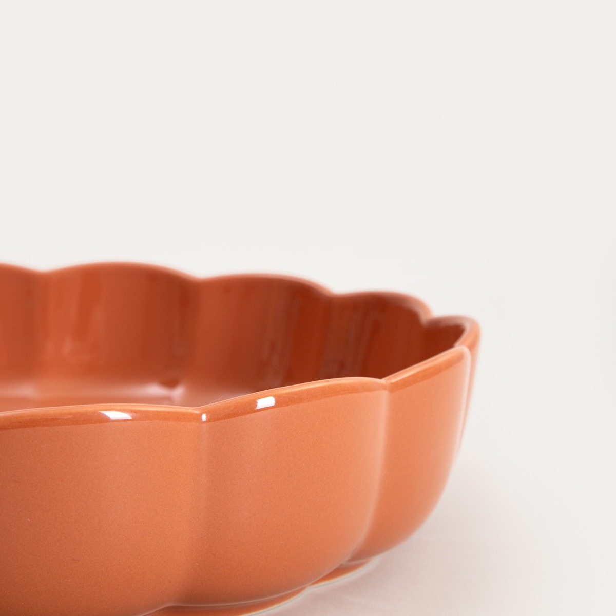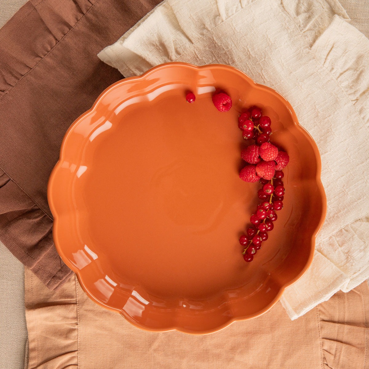 The BRISA round dish impresses with its simplicity of form and subtle finish. It provides an excellent backdrop for the dishes served and adds an appetizing appearance to the dishes. The wavy rim adds a decorative touch and the warm shade of stoneware makes the table instantly welcoming and inviting.