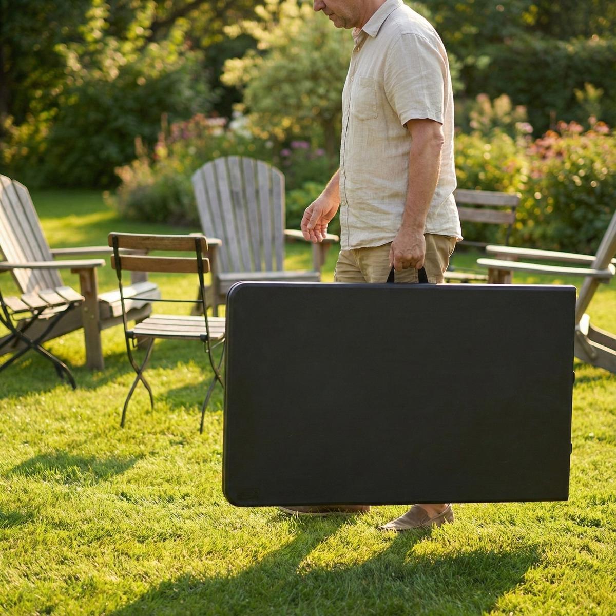 When folded, the table takes the form of a handy suitcase with a handle. This is ideal for quick transport and storage in small spaces, such as a car trunk or glove box.