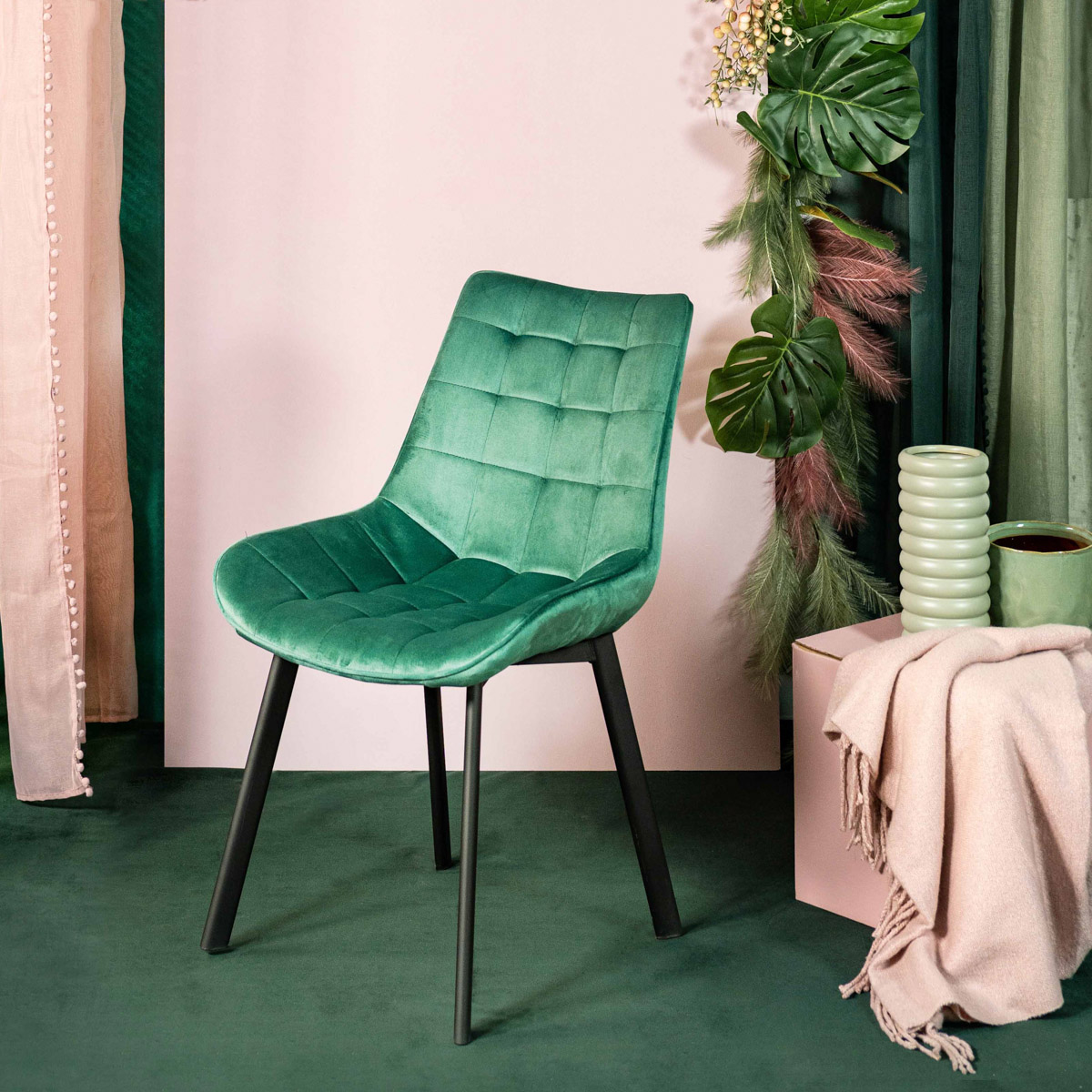 If you are looking for a new chair in which to relax in the afternoon sun, you have come to the right place! COLIN velour chair is an extremely comfortable and beautiful chair that will delight all your guests. The deep, elegant green of the fabric and the black of the metal legs will fit into many a dining room or living room arrangement.