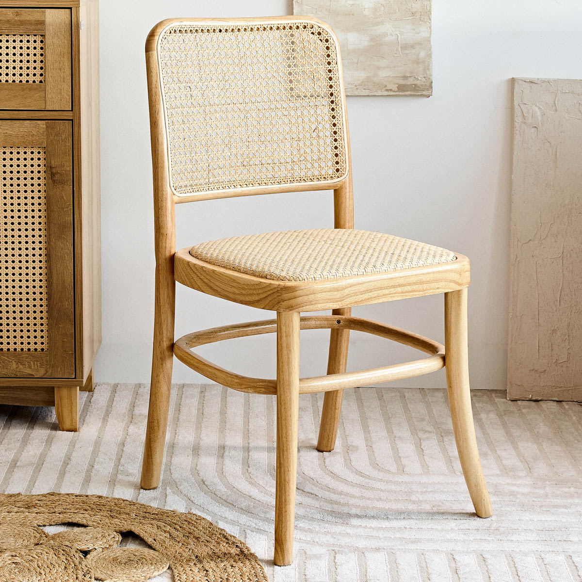 The chair’s frame is made of solid wood, which ensures a stable structure. We used rattan for the backrest and seat, which complements the look of the furniture wonderfully.