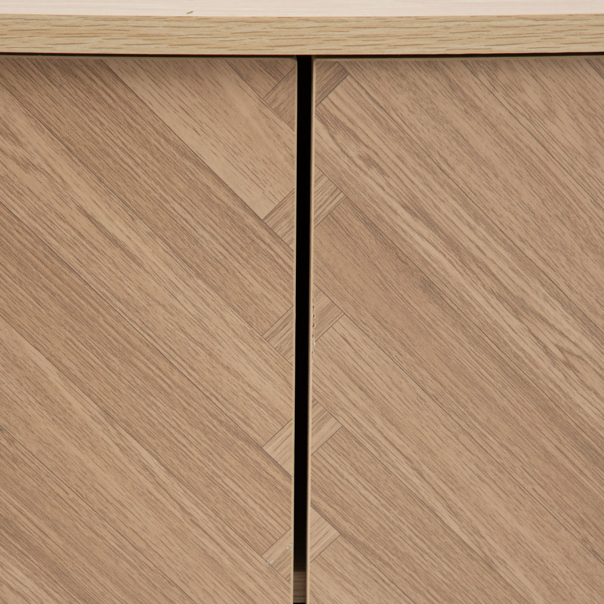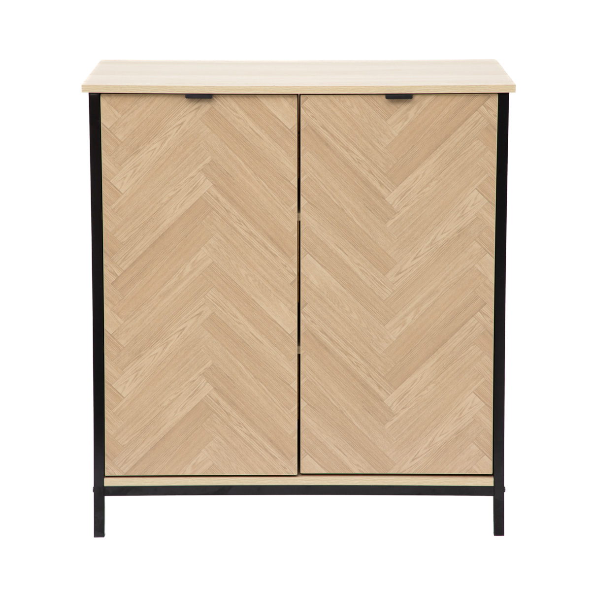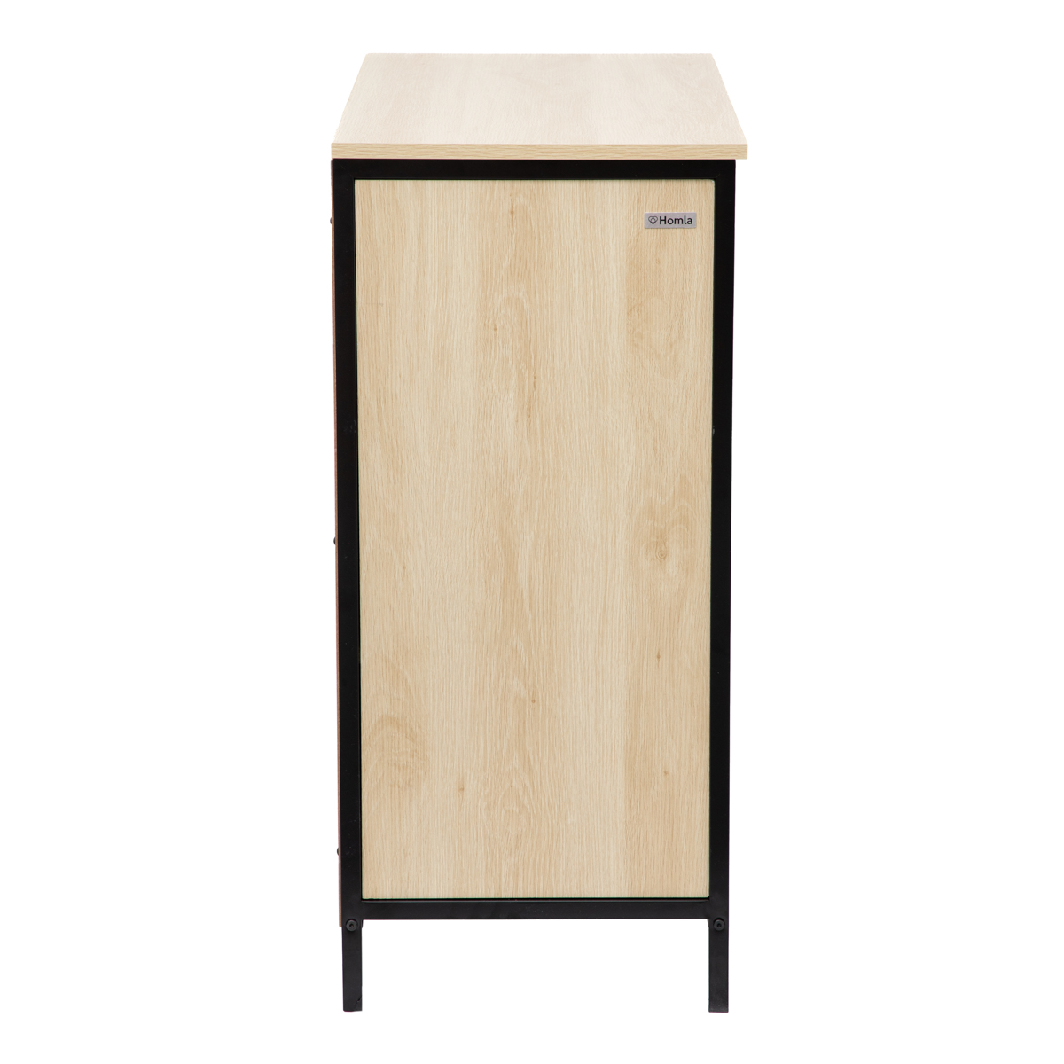 The stylish HOMLA SWEN chest of drawers is a unique combination of functionality and modern design. The fronts of the furniture are distinguished by their original pattern, which resembles a classic herringbone pattern. The natural color of the wood has been enlivened with a black metal frame, which introduces a loft-like accent. Thanks to this, the chest of drawers will be a perfect complement to modern arrangements. The capacious cupboard conceals shelves on which you can place any objects, ensuring order and tidiness in the room. On the other hand, you can use the top of the chest of drawers as a space to display decorative accessories, flowers and your favorite photographs.