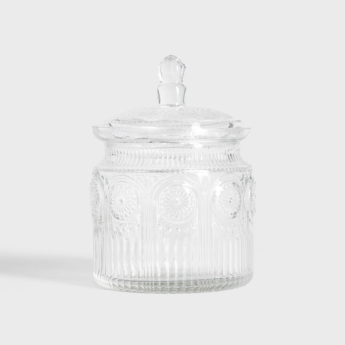 Are you looking for a storage container that is not only practical to use, but elegant at the same time? A glass container with decorative embossing and a decorative lid is the perfect choice no matter what you intend to store in it. Its unique design impresses with its details.