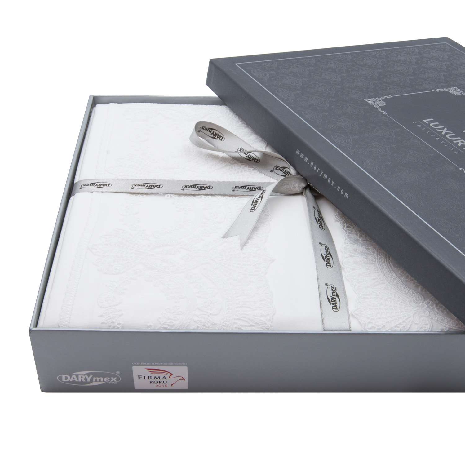 Luxurious, elegant bedding set, made of high quality cotton satin woven with NE 40/1 yarn and 210TC density. This fabric is very smooth, soft and pleasant to the touch. The comforter cover and pillowcases are decorated with strands of wide, decorative guipure. The duvet cover is zippered, and the pillowcases have a hotel tab. This bedding will meet the expectations of the discerning customer looking for a high-end product. It is packed in an exclusive box and can be an extra luxurious gift. The bedding sets are made of OEKO-TEX certified fabrics.