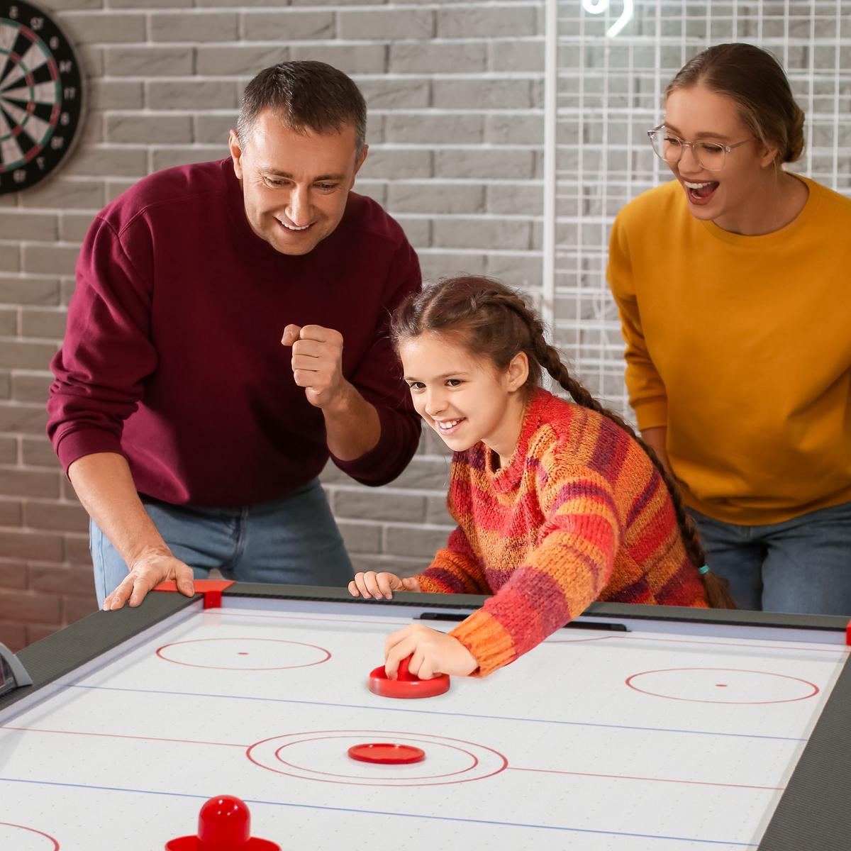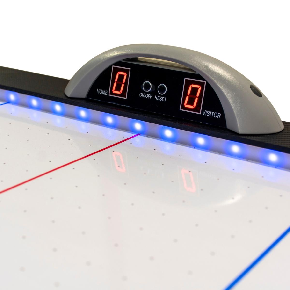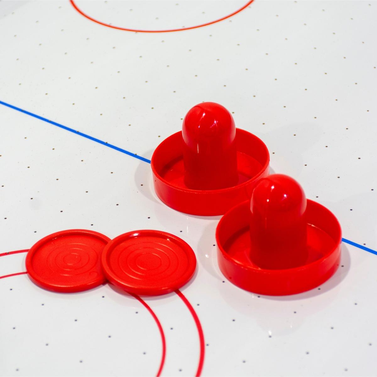The table has a special fan connected to the power supply, which blows air through the perforated surface, slightly lifting the puck. This gives during the game an effect similar to the sliding of the puck on a sheet of ice.