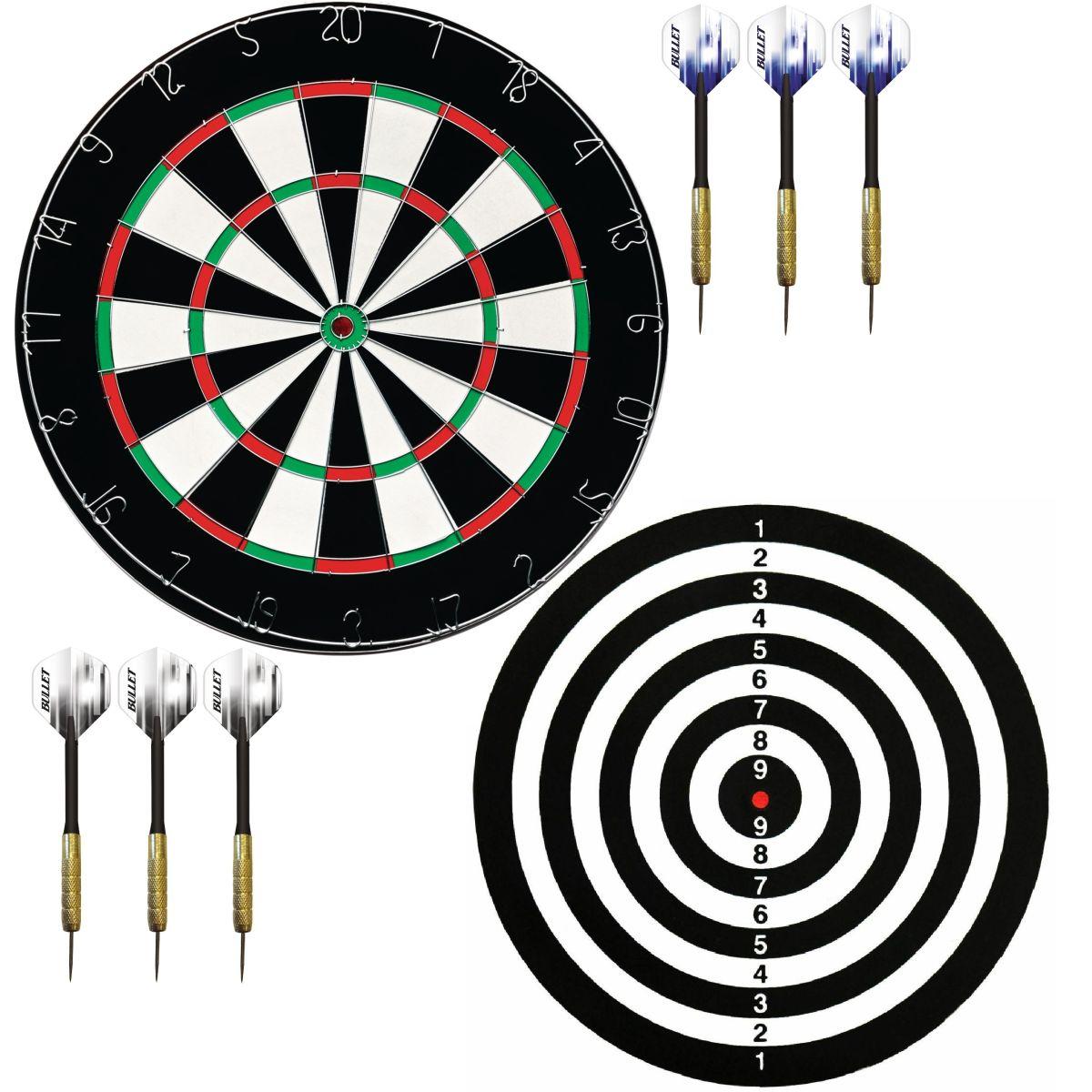 - : double-sided target, 6 brass-plated steel barrel darts, 6 250 micron darts in two colors (black and white and navy blue)