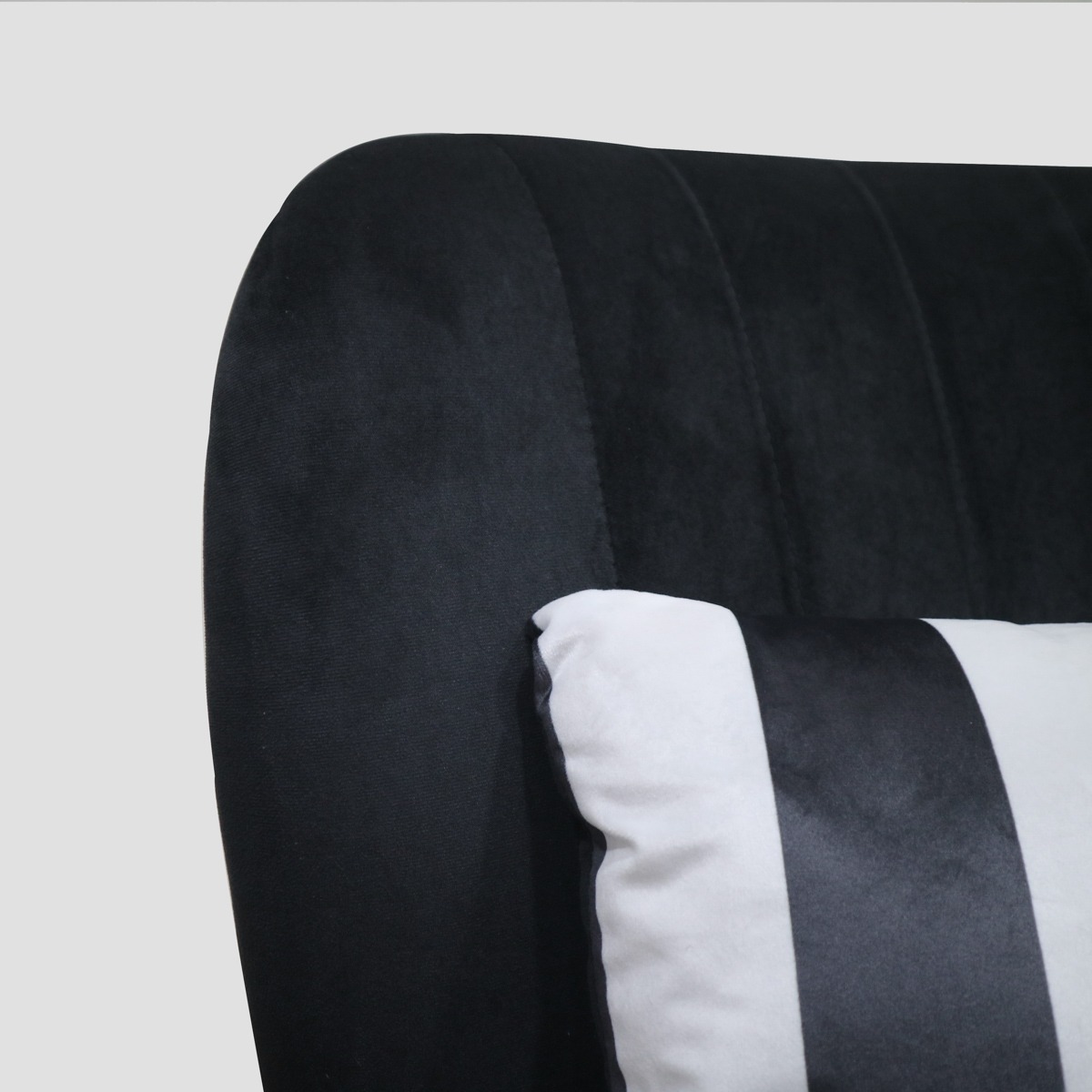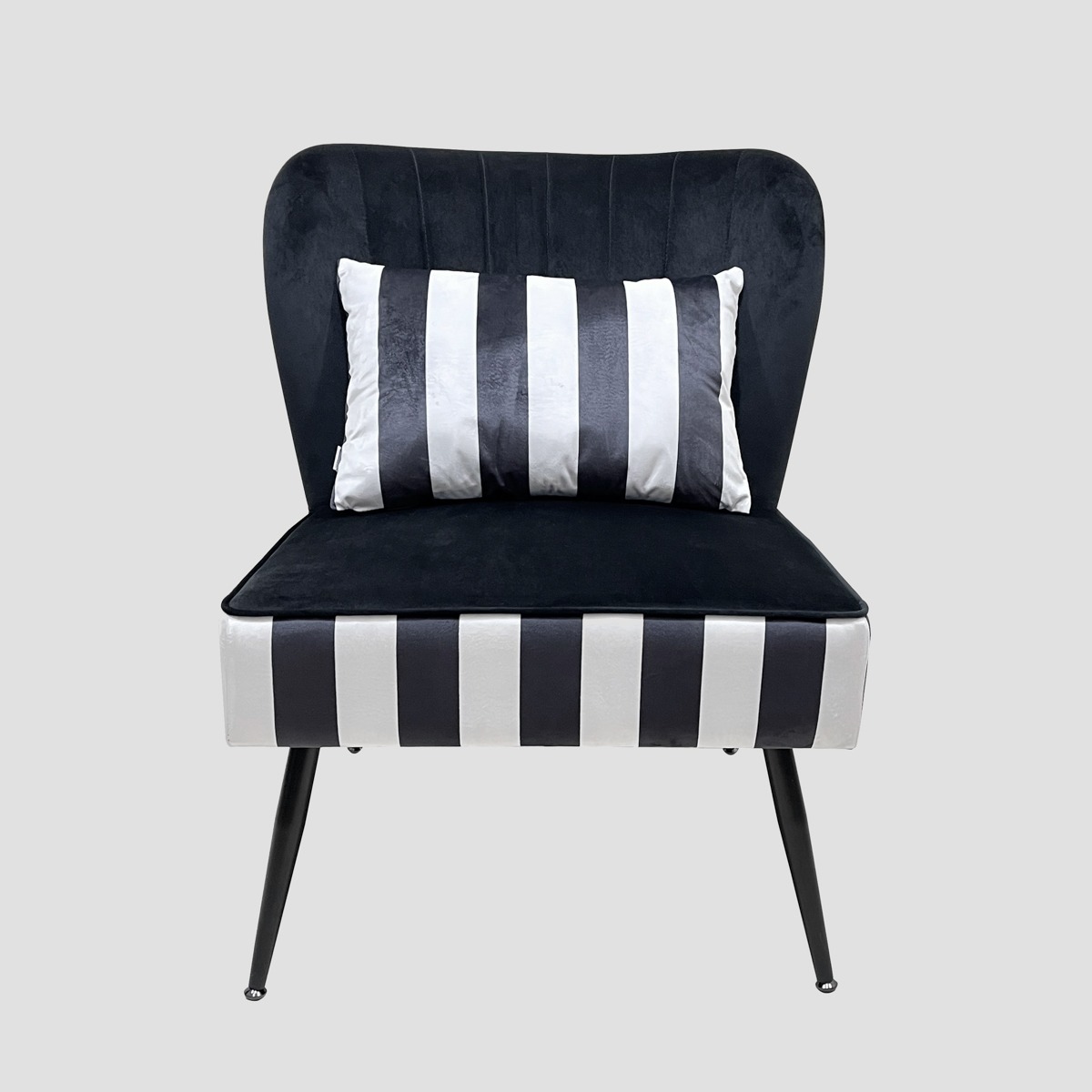 The CARNIVAL armchair is a combination of comfort and distinctive style. Its unique design, characterized by elegant black upholstery combined with white and black stripes, makes it the focal point of any room. Its versatile form makes it fit into both minimalist and more decorative spaces, adding character and dynamism.