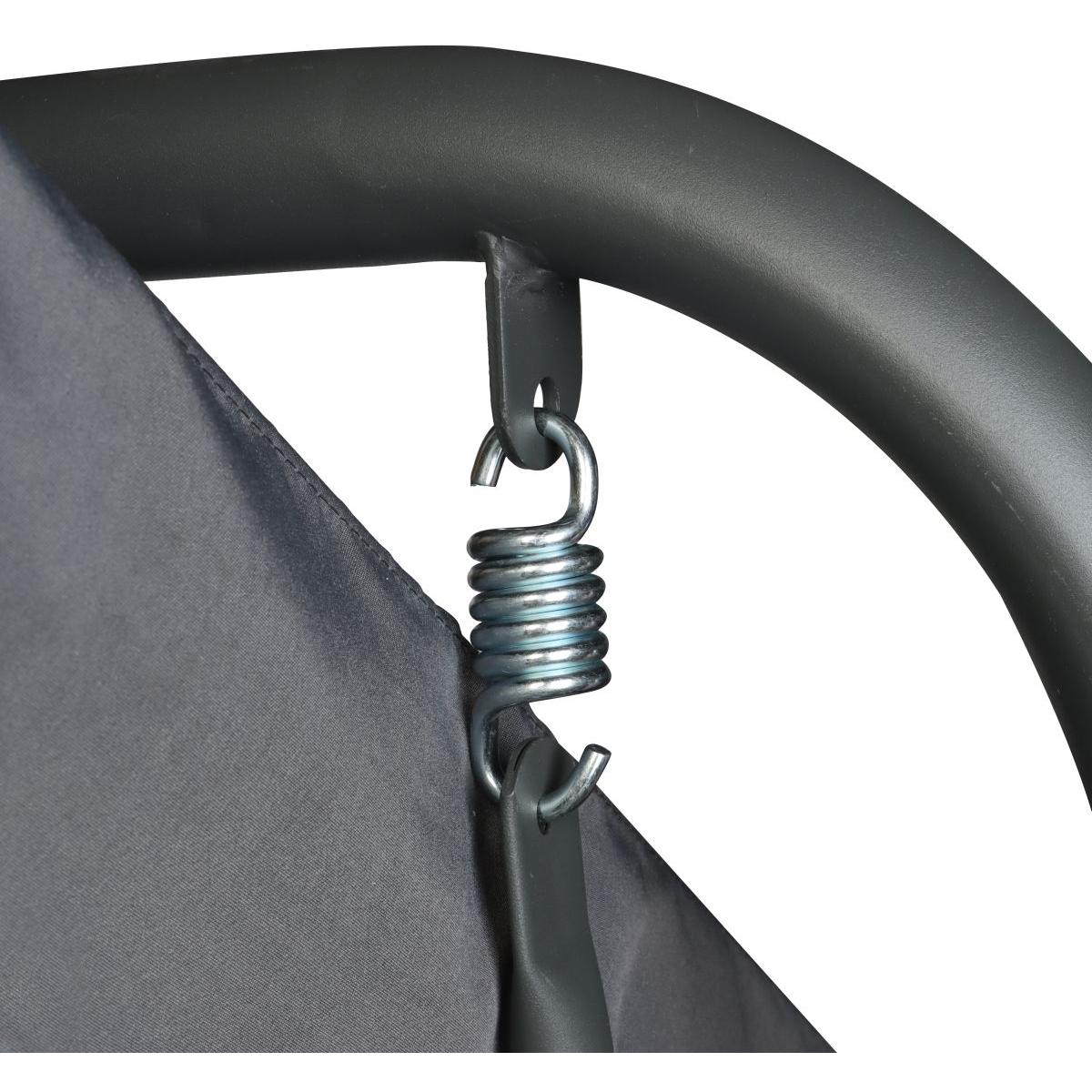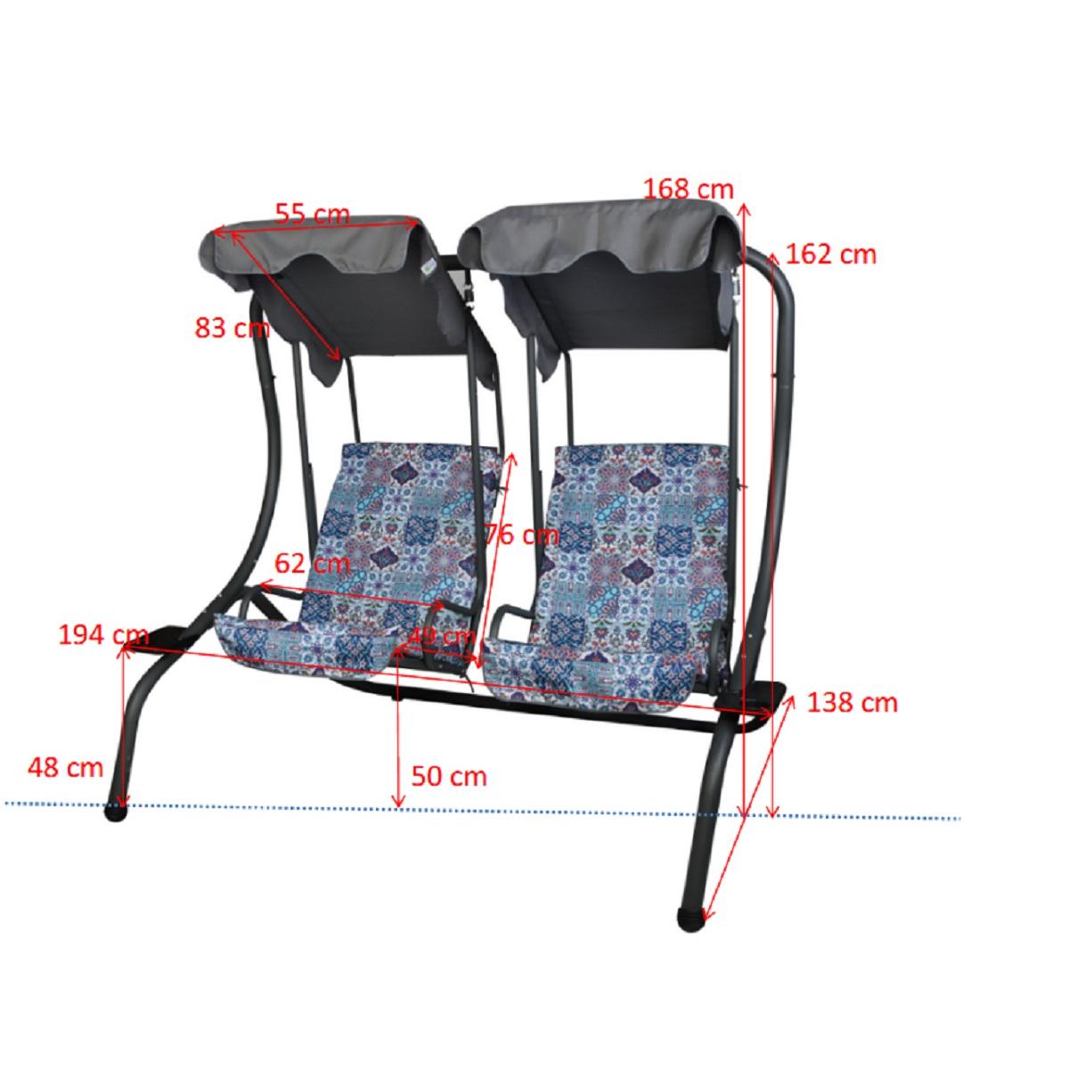 – 180g/m2 waterproof polyester (canopy and seat), 300x600D oxford PVC polyester (cushions), steel frame