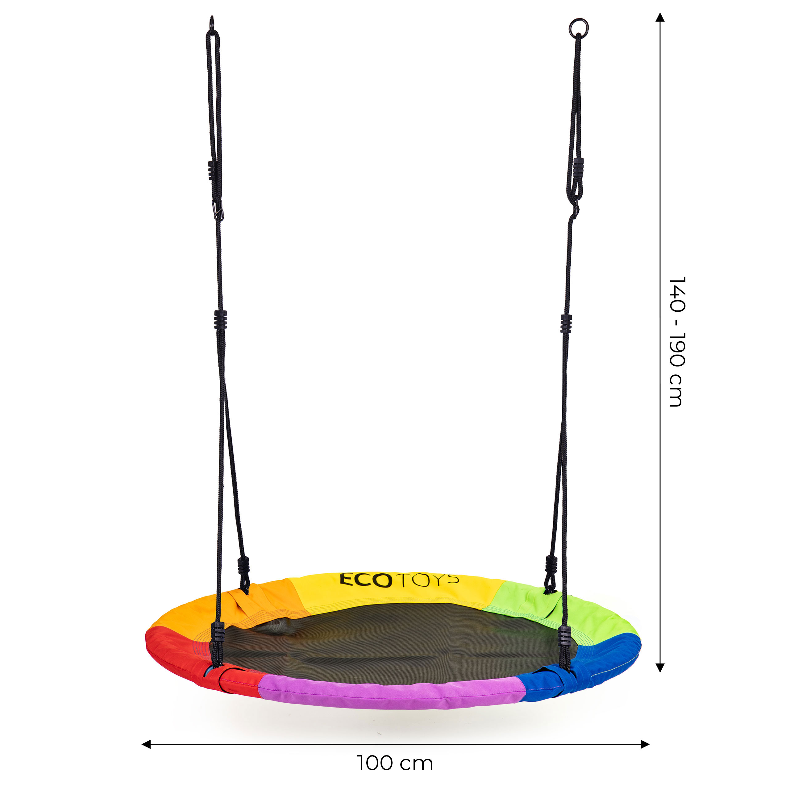 - The swing features 2 adjustable ropes with a thickness of 10 mm made of durable material and a comfortable 100 cm diameter seat with foam-covered frame for safety and comfort. The ropes are equipped with metal rings for mounting, making the swing very easy to install. You can hang it on a swing frame or a tree branch.