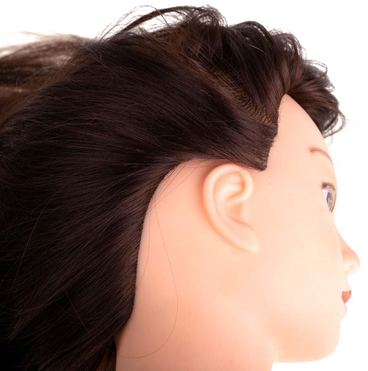 Hairdresser head with hair for practicing different types of hairstyles.