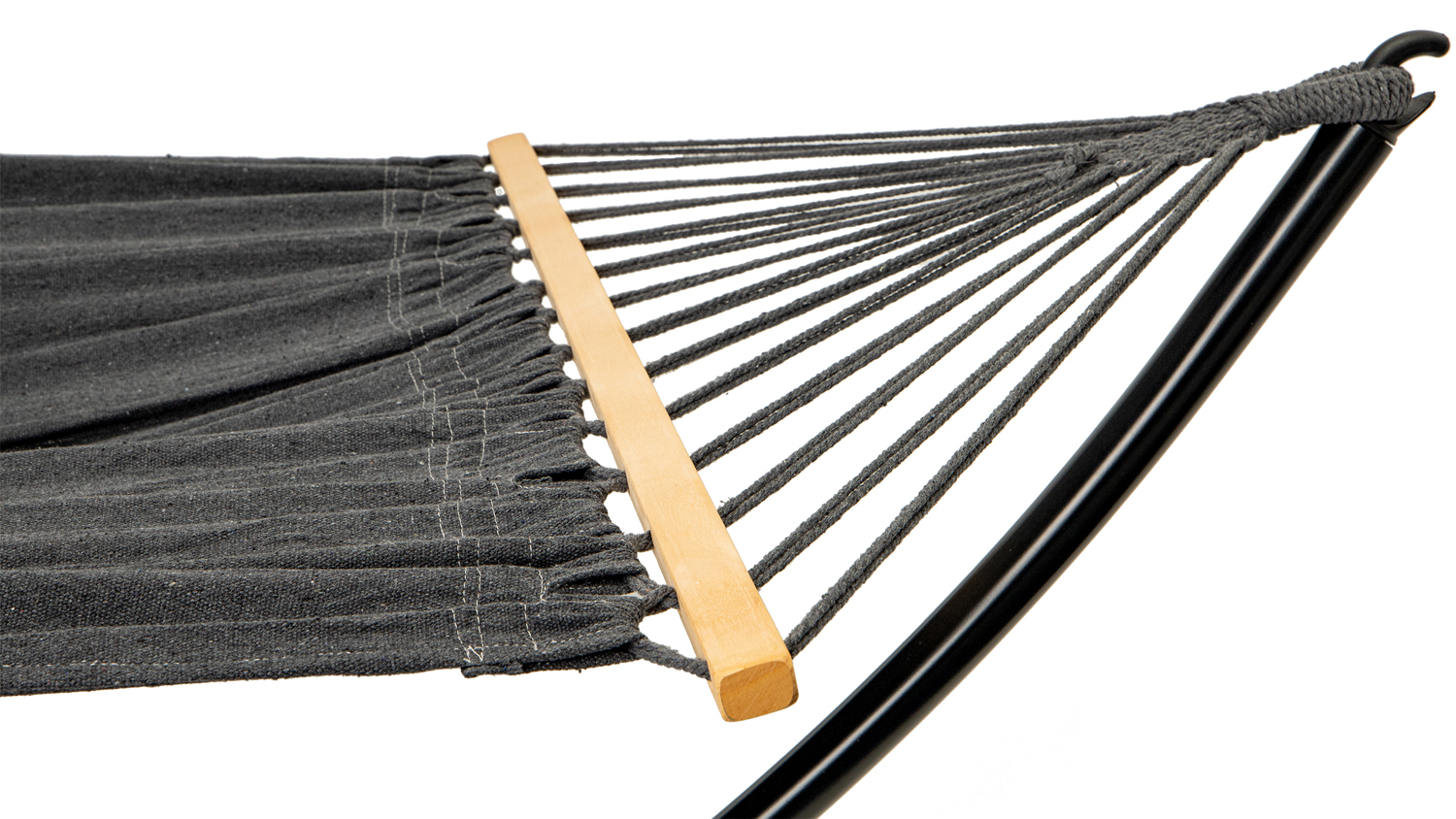 The hammock is made of durable fabric which conforms comfortably to the body. Wooden spreader bars woven with supporting cords ensure the lying surface remains properly taut and flat.