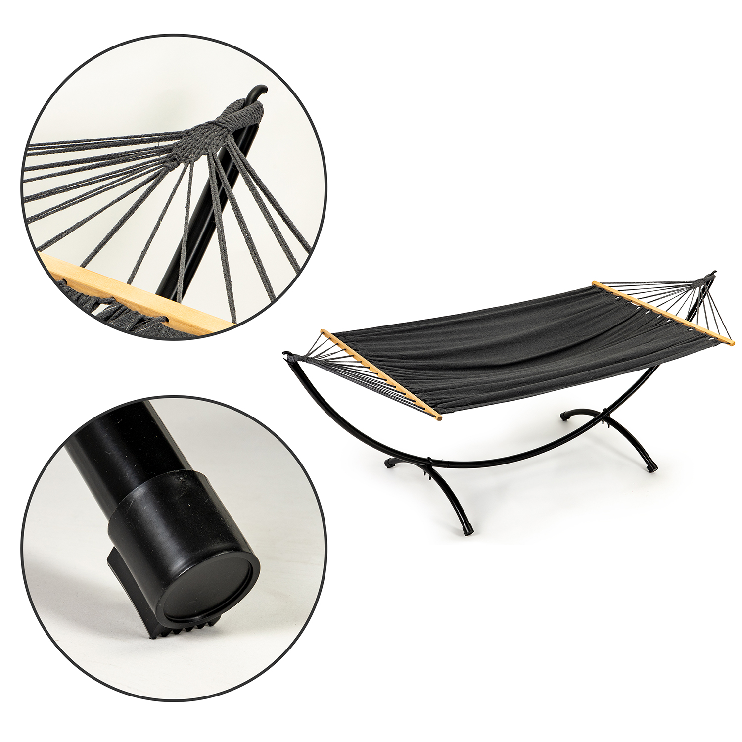 - Ends of the hammock feature specially braided, durable ropes that form a loop (“ear“) which attaches to the frame. The entire assembly supports up to 150 kg.
