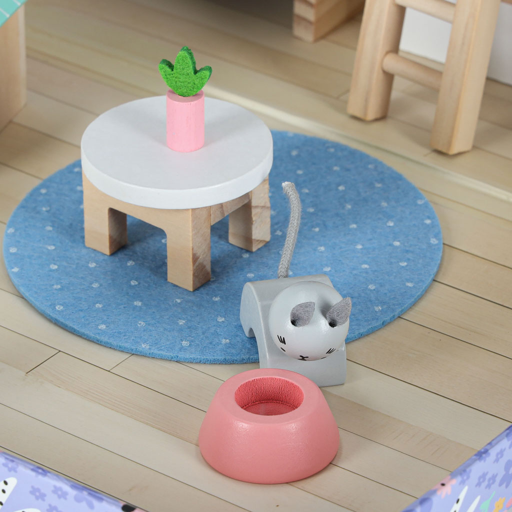 The house is home to a dog and a cat – they have their own bowls, as well as beds in the form of a kennel and a scratching post. The various accessories in the set give many ideas for creative play. After use, the furniture can be stowed back into the case, making it easy to keep things tidy.