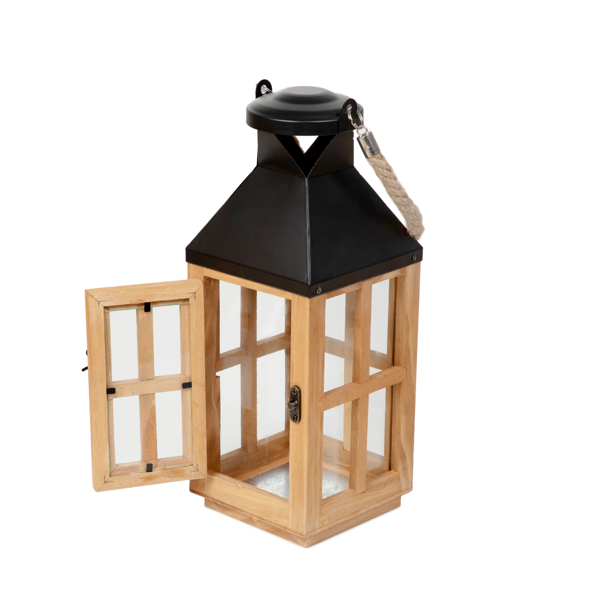 BUREL lantern is made in the shape of a cuboid with a triangular top. The light wood-colored frame, transparent glass and black inserts look elegant. The product has an opening door, which is closed with a delicate clasp. The lantern is equipped with a vent, which ensures safety. The product can be hung.