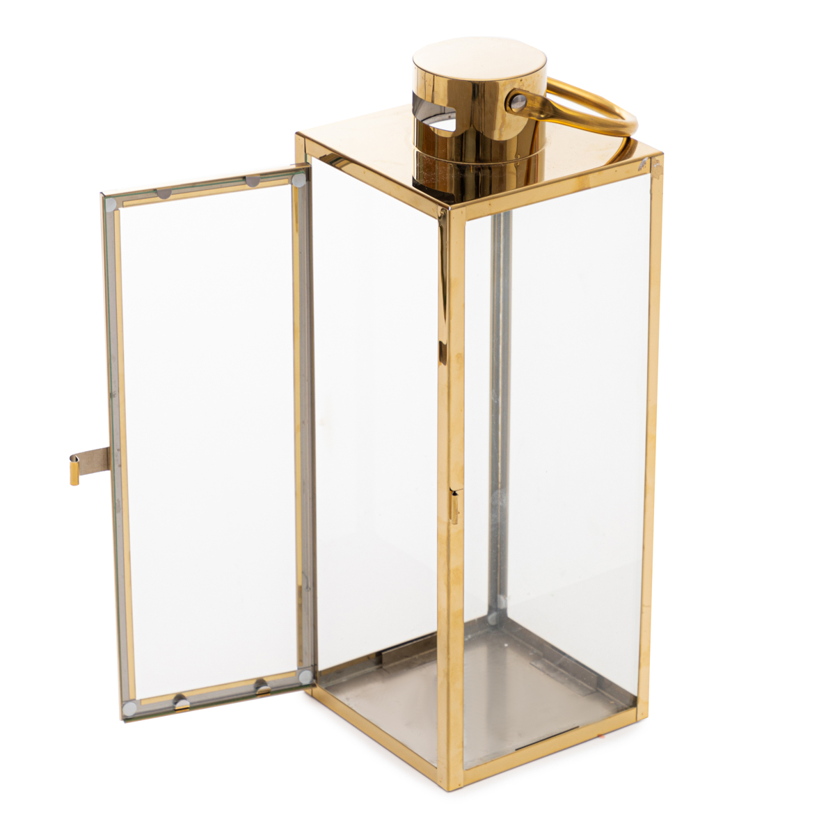 TONDO lantern has a cuboid shape. Gold elements decorate the transparent walls. The top vent will ensure fully safe use. The lantern has a side door, through which you can conveniently place a candle inside it. The dimensions of the product are 18 x 18 x 50 cm.