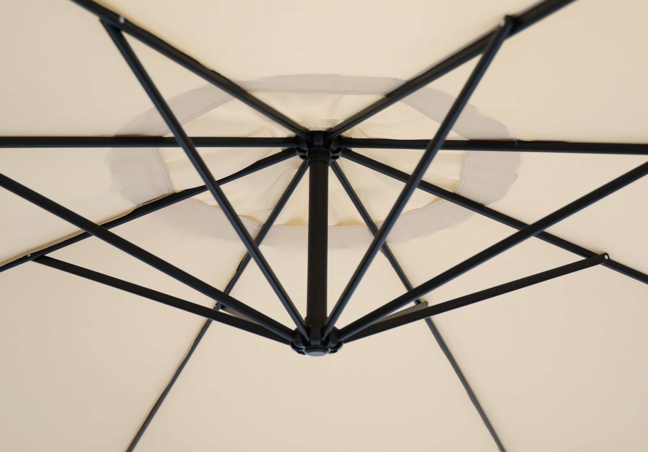 The parasol stands on a cross metal base, which should be mounted to the ground using dedicated holes. If you want to place it on soft surfaces like grass, you can use universal garden umbrella weights to secure the base.