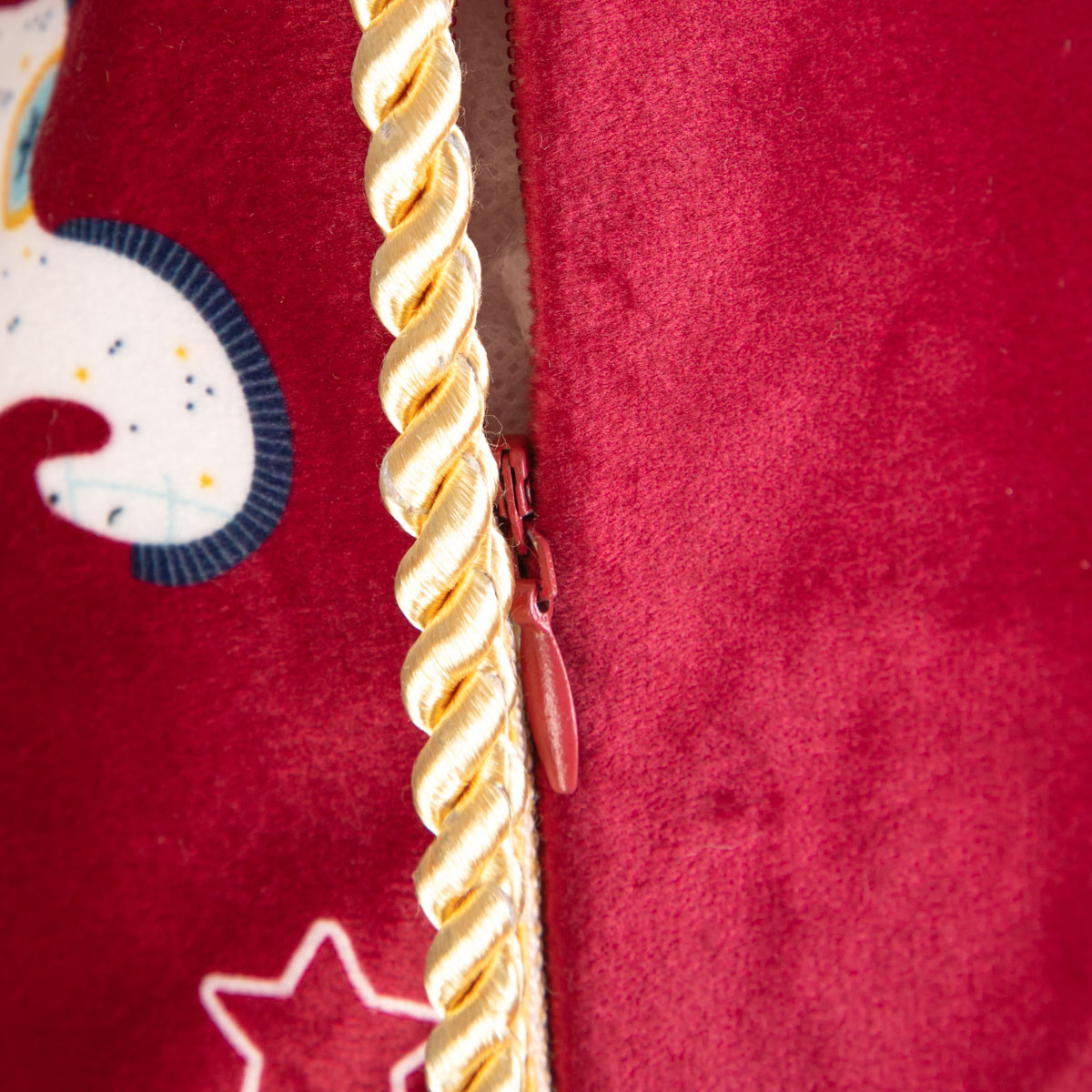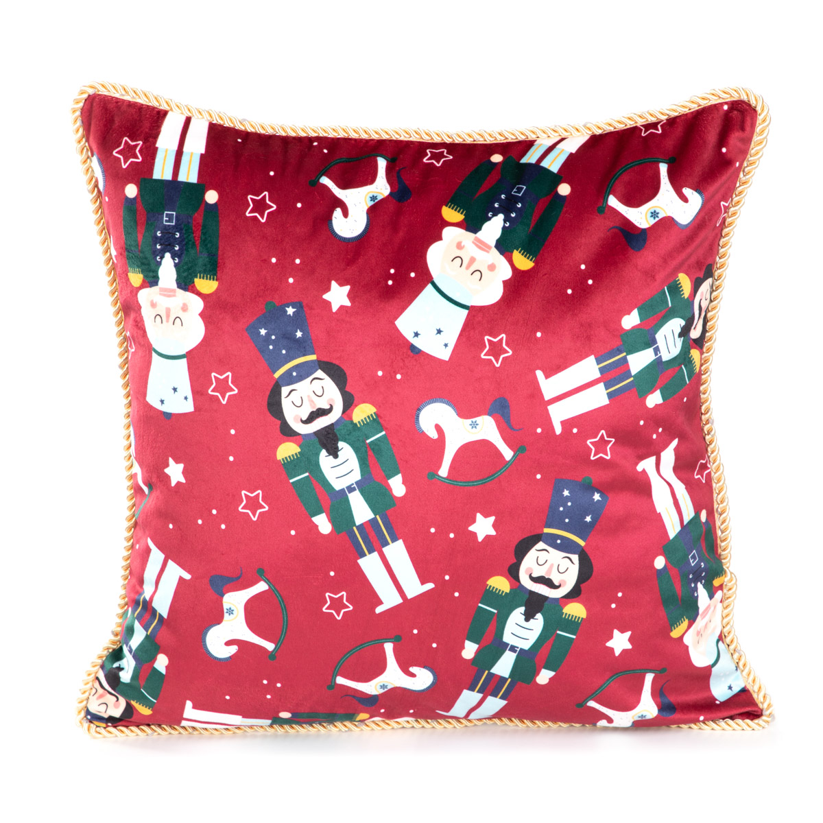 The AITONA cushion cover is double-sided – the back side is plain and the front side is decorated with a Christmas pattern. The whole cushion has a beautiful red color. The pattern consists of a composition of nutcrackers, rocking horses and stars. The pillowcase is 45 cm wide and 45 cm long. It fastens with a zip placed on the side. It is trimmed all around with beige piping in the form of a decorative, spirally twisted cord.