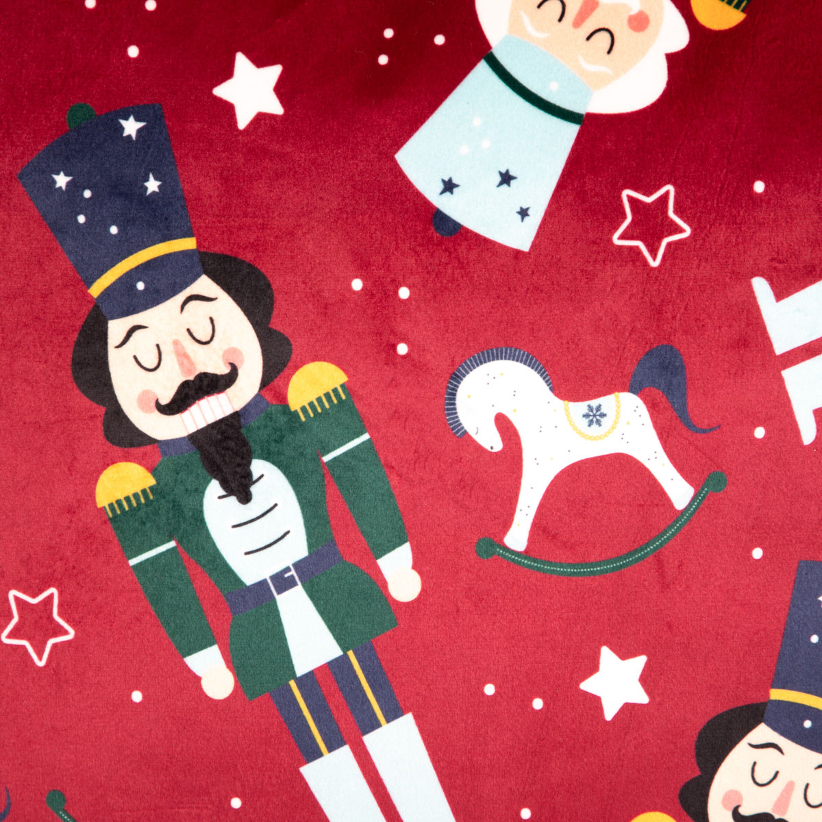 Red pillowcase in festive nutcracker pattern with piping.