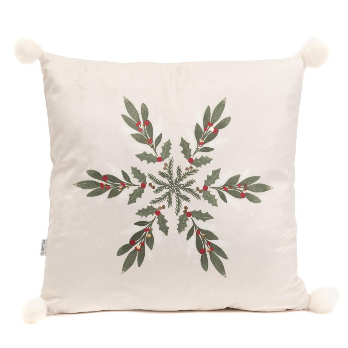 The GALOS pillowcase has been designed in a minimalist style. The pillowcase has been kept in a beige color. The centerpiece features a sprig of mistletoe in a muted shade of green with red fruits. In addition, the pillowcase is decorated with pompoms located in the four corners.