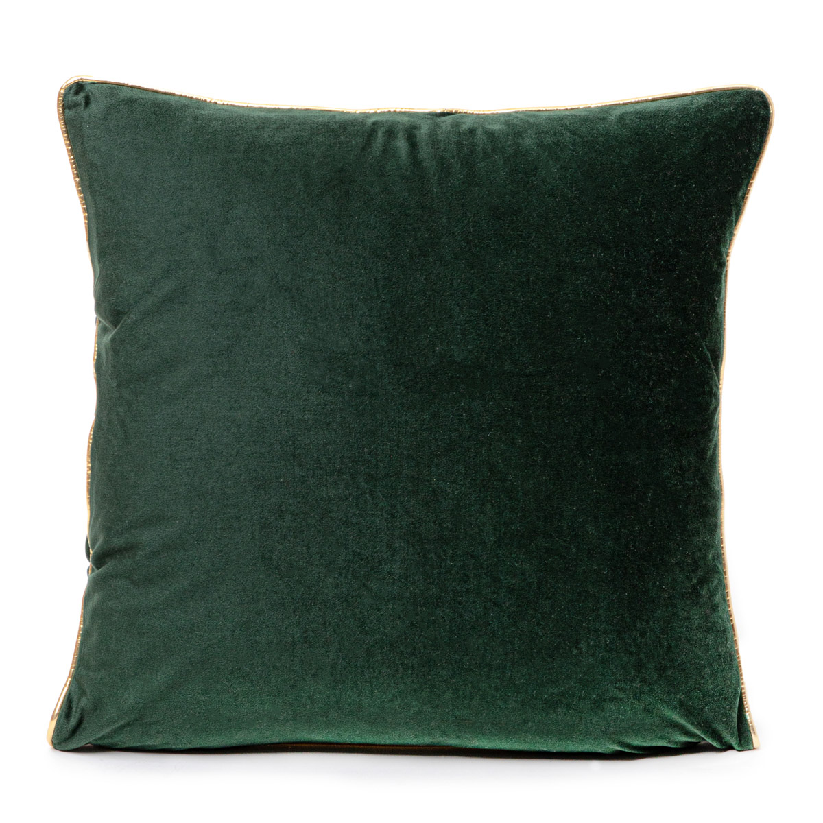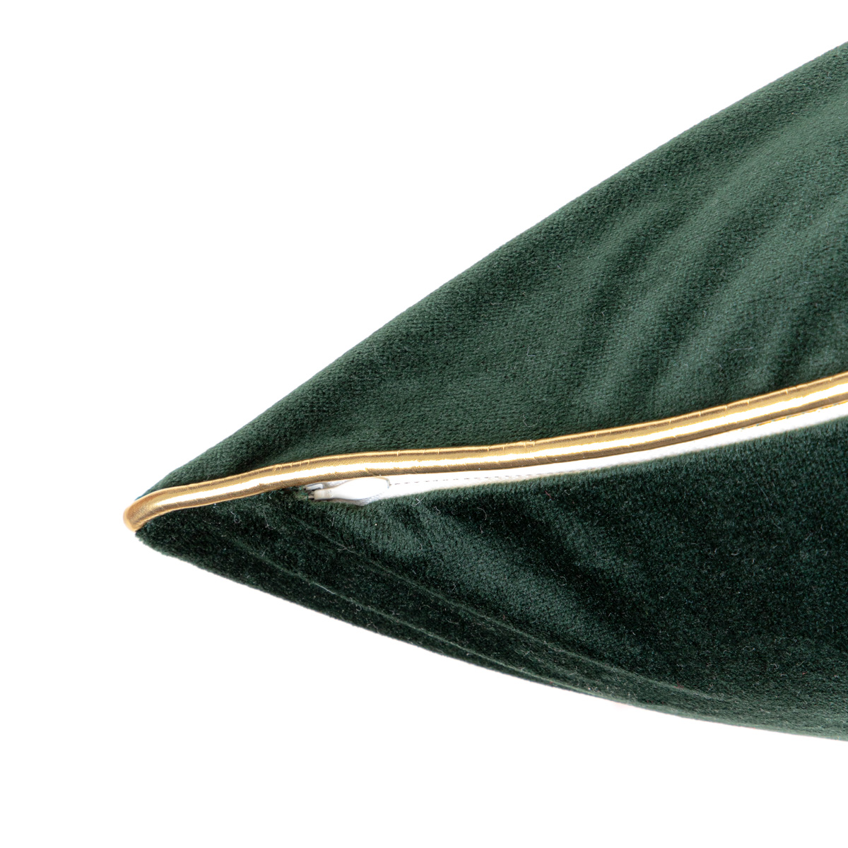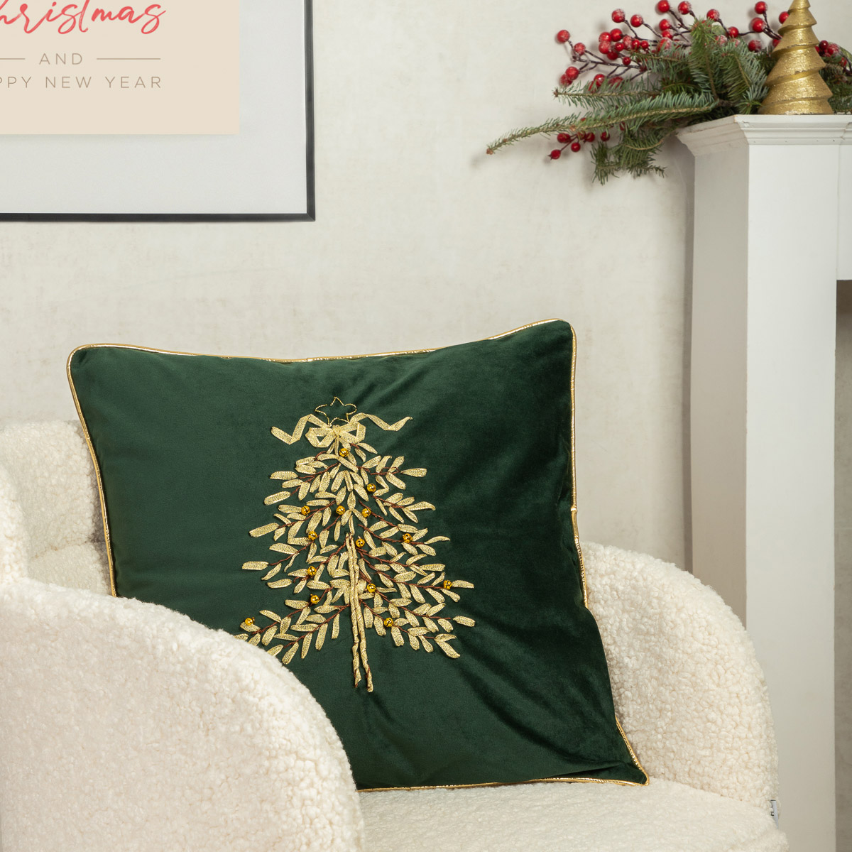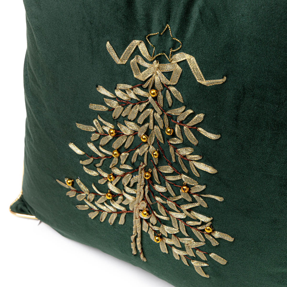 Decorative HOMLA JULE pillowcase with gold piping, a Christmas tree made of gold ribbon and gently ringing round bells. The deep green blends perfectly with the gold accents, the cushions covered in the JULE pillowcase will fit perfectly into stylishly decorated glamour interiors.