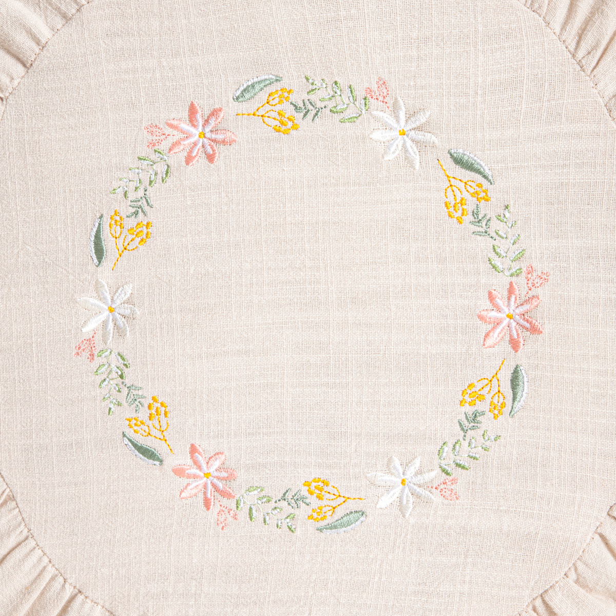 Transform your interior design with the BANF pillow. Its round form with a crinkled valance creates an elegant, decorative detail that looks beautiful on a sofa, armchair or bed. Delicate embroidery in the form of a floral garland adds a spring accent to the arrangement, and the light ecru shade harmoniously harmonizes with any room.