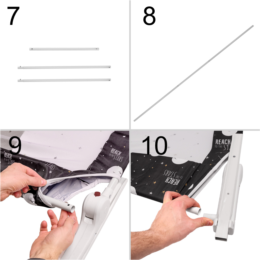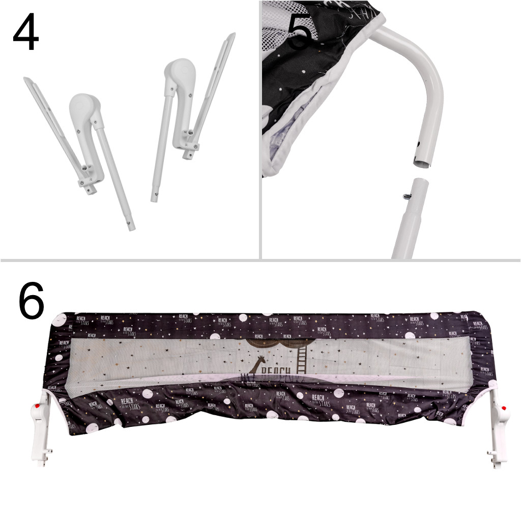 The practical guardrail protects against accidental falls, providing comfort and safety for all household members. Installation is extremely easy – just fold the frame, slide it into the fabric mesh hem, and then place the stands under the mattress.