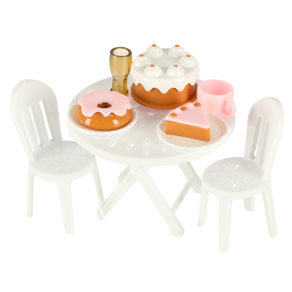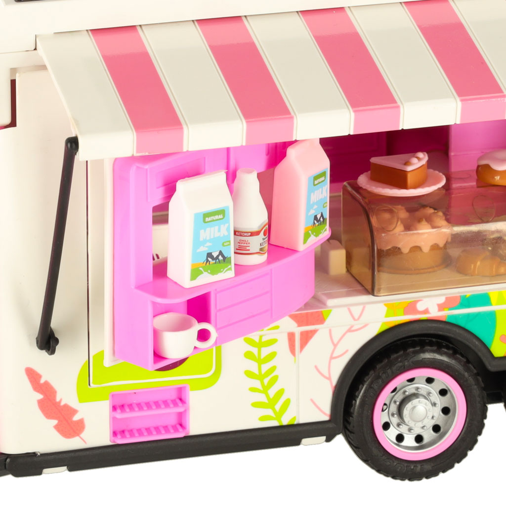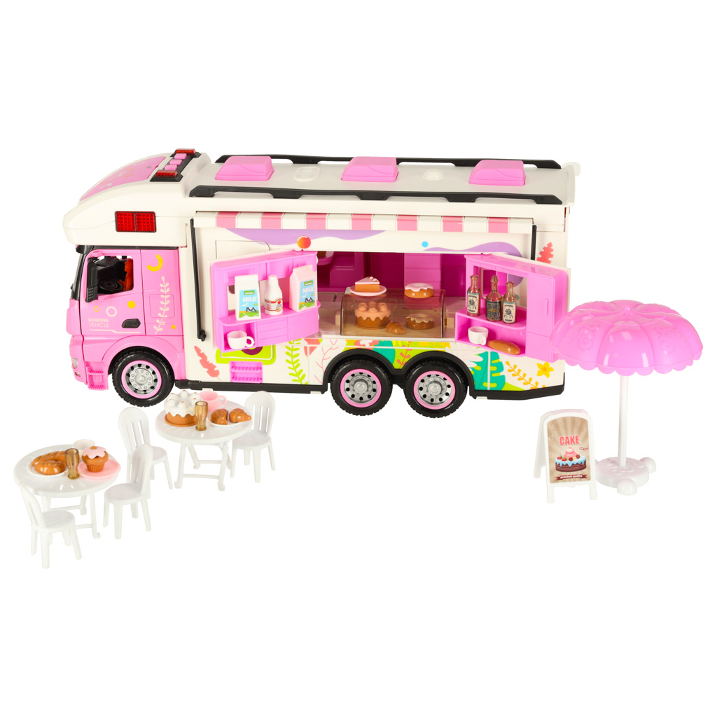The camper comes with mini accessories for self-assembly. Mini tables, umbrellas and chairs resemble the arrangement of a real food area. Colorful lights and sounds enhance the fun atmosphere.
