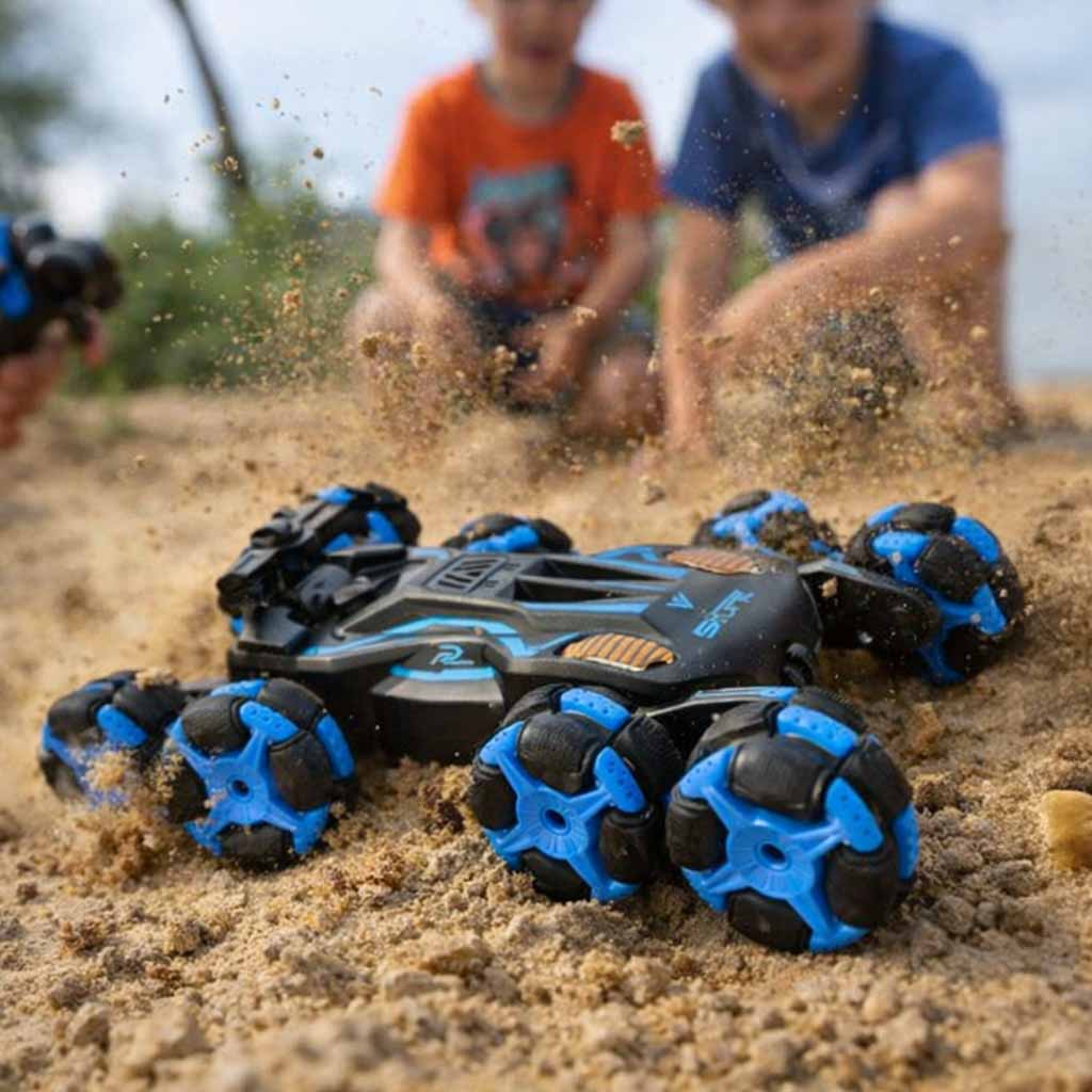The young driver has a choice of two remote controls: a classic controller or a more advanced palm controller that lets you control the car with gestures. Either option allows precise control and lots of fun!