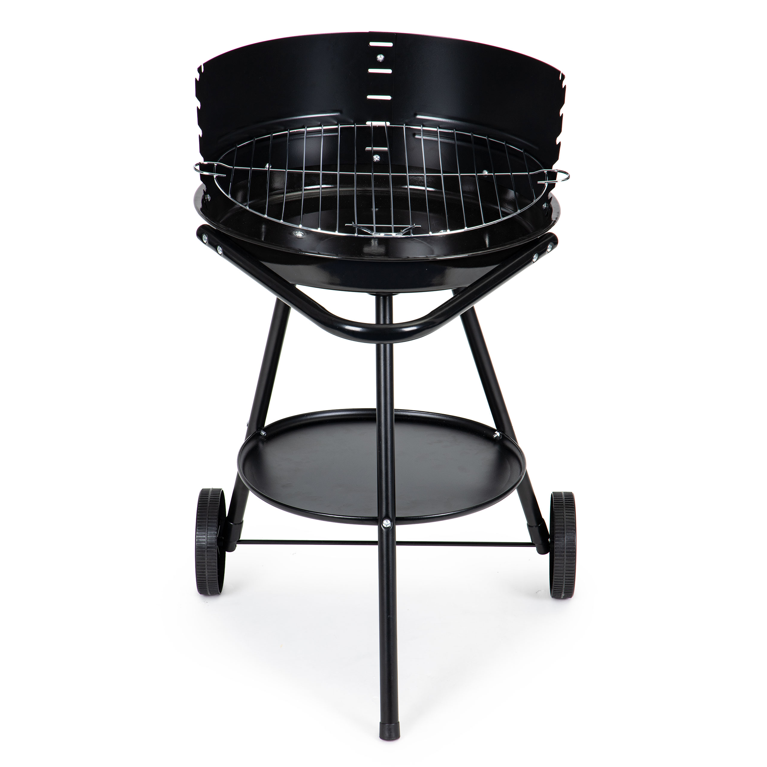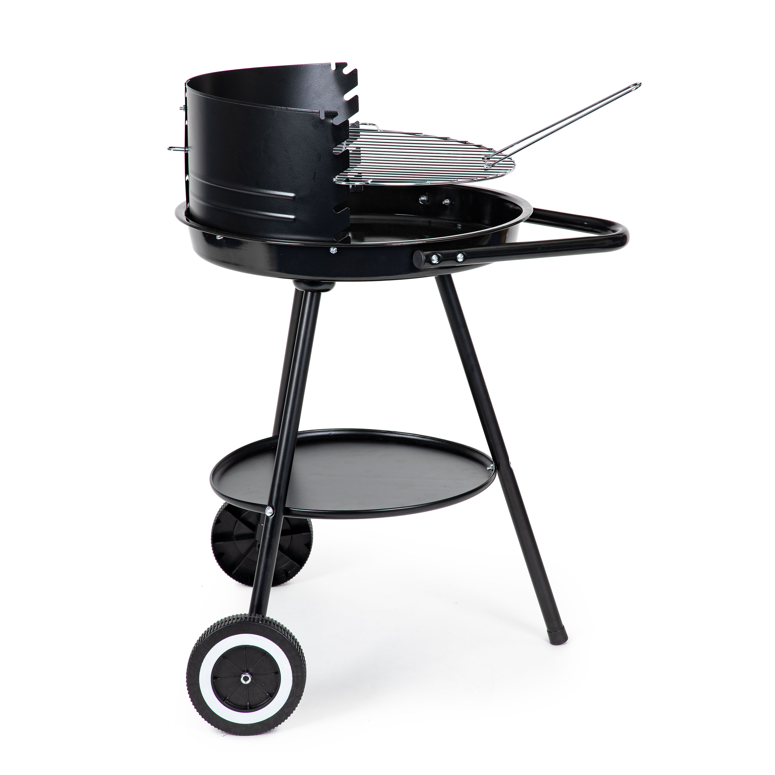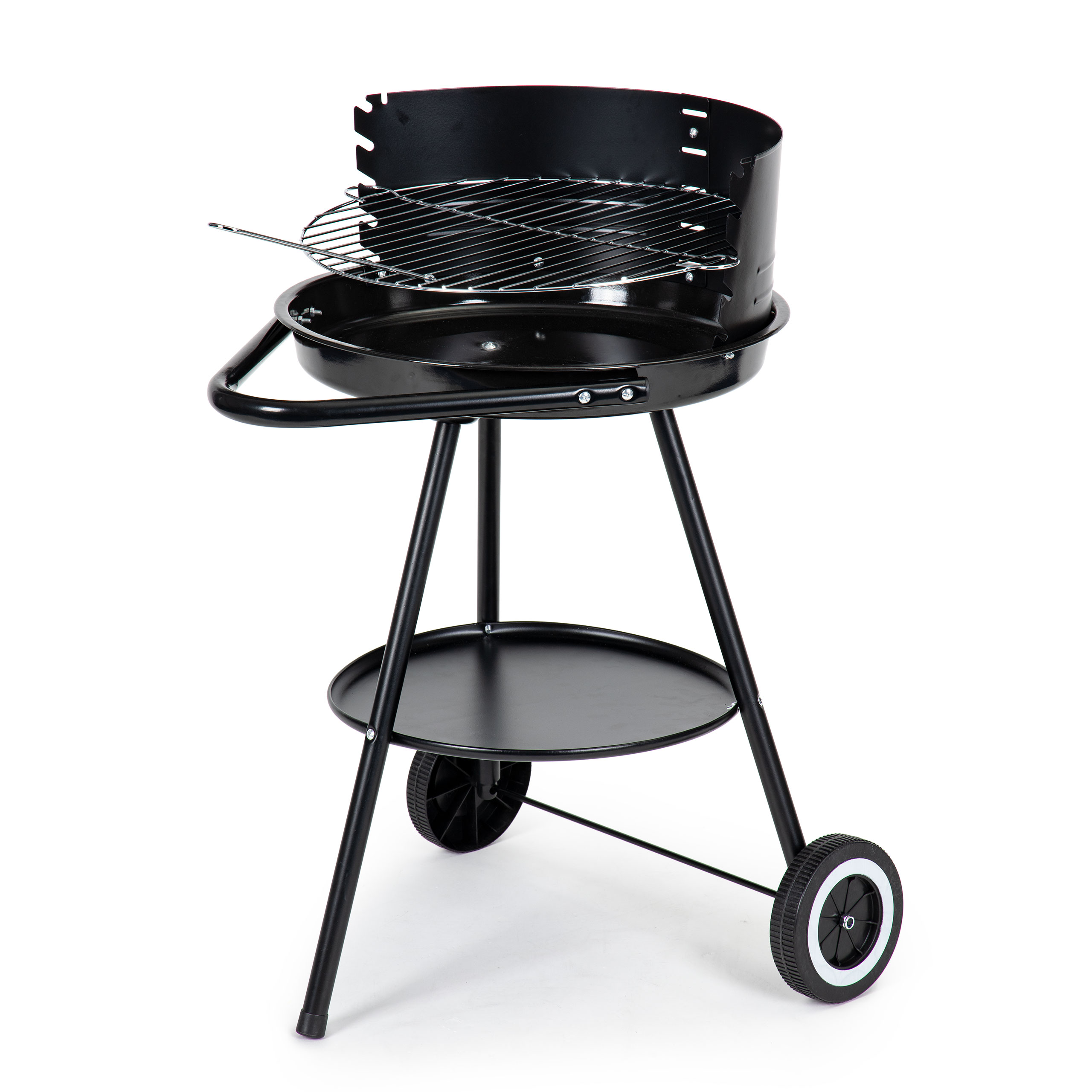 A functional shelf below the firebox provides storage for charcoal or other grilling essentials.