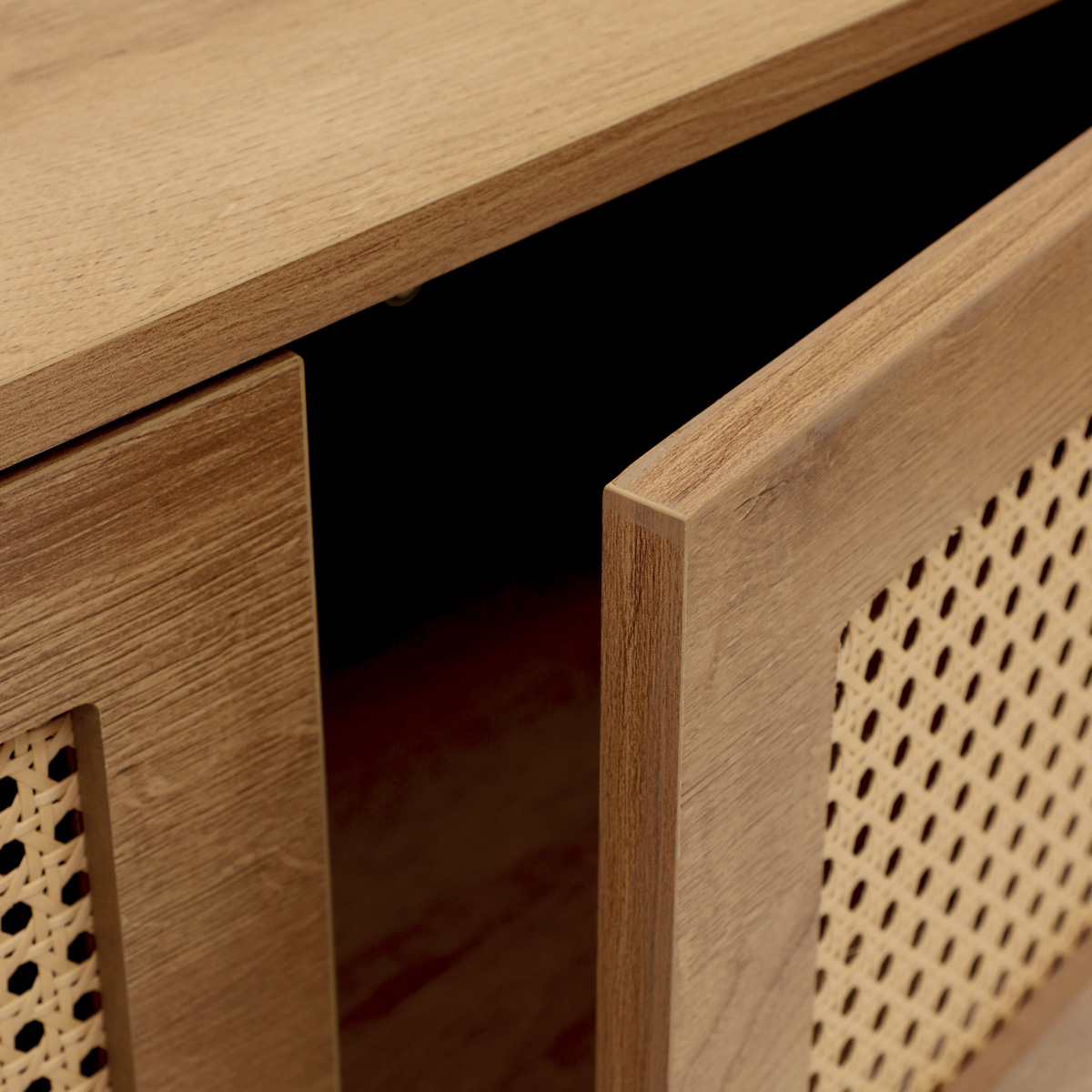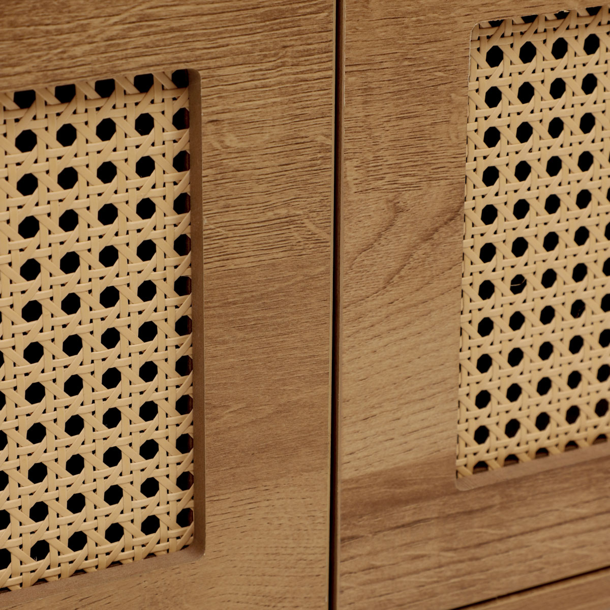 The cabinet is made of MDF, which is a commonly used material in furniture production. The cabinet fronts are finished with rattan, and the entire piece of furniture is set on metal legs. All materials used are characterized by durability and are resistant to damage.