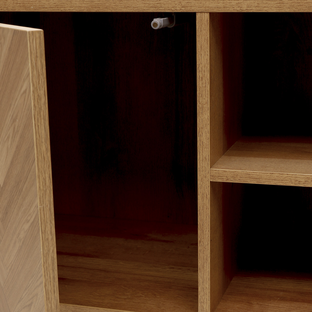 The cabinet is made of MDF, which is durable and resistant to damage. The furniture is supported by metal legs, which have been powder-coated, making them aesthetically pleasing and corrosion-resistant.