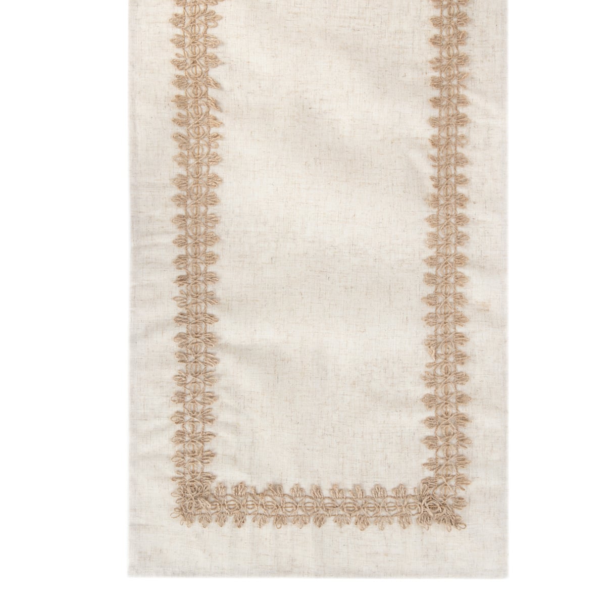 The table runner is made of polyester fabric with a touch of linen, which makes it durable, lightweight and comfortable on the table. All sides are neatly hemmed to prevent fraying.