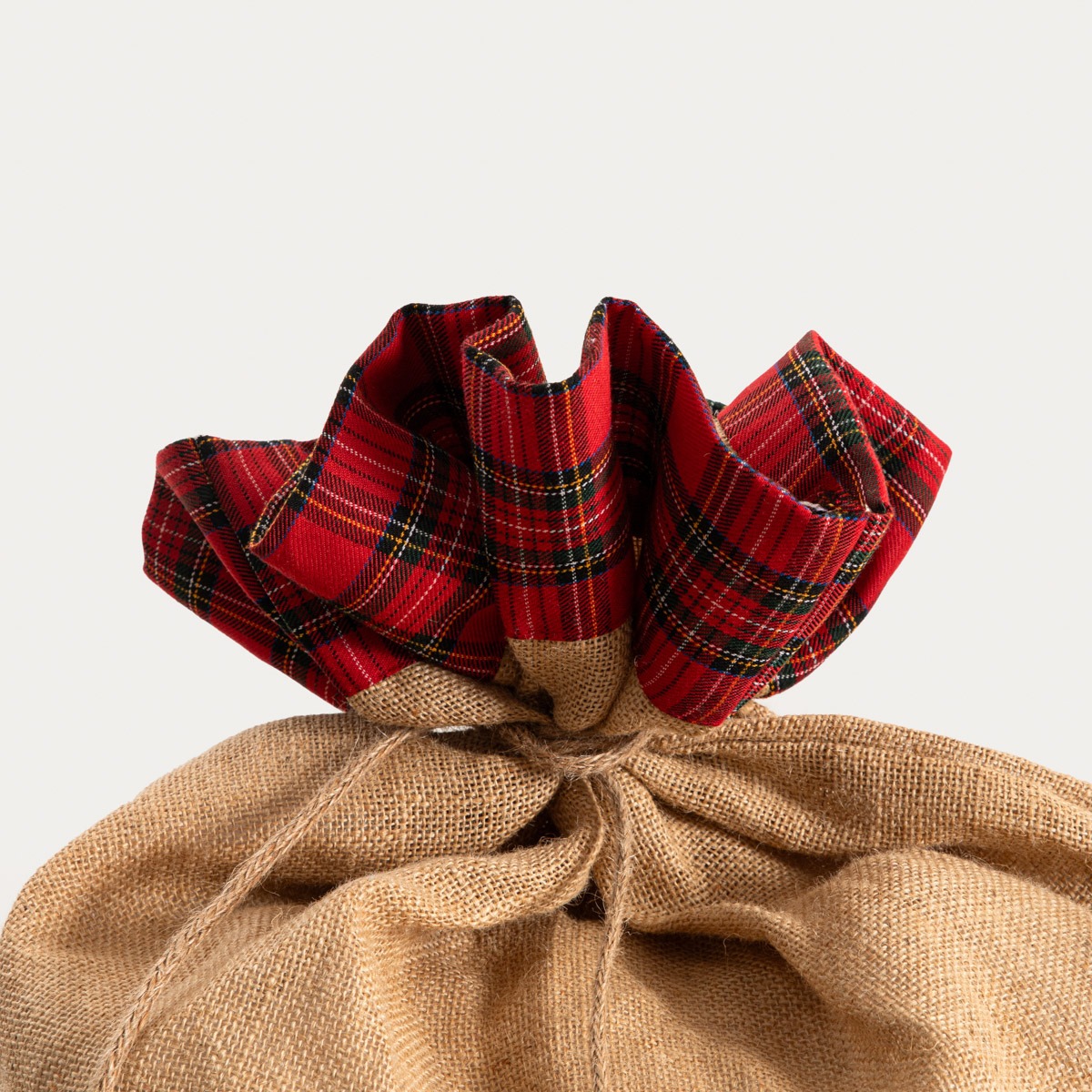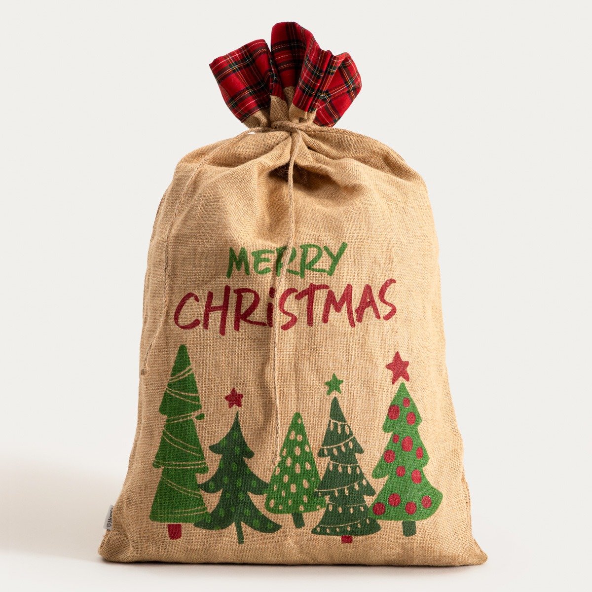 The bag is made entirely of natural jute, making it durable and reusable. To maintain its aesthetic appearance, it is recommended to store it in a dry place and avoid contact with moisture. Thanks to its sturdy workmanship, the bag will last for many festive seasons.